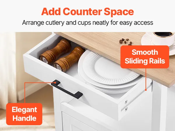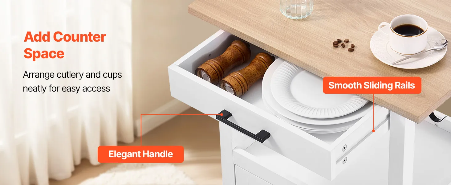 This kitchen island is equipped with soft-close mechanisms, the drawer offers seamless, silent operation while keeping essentials organized and within reach.