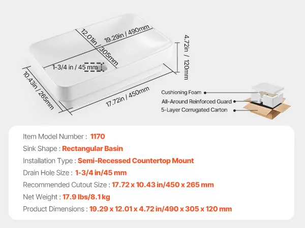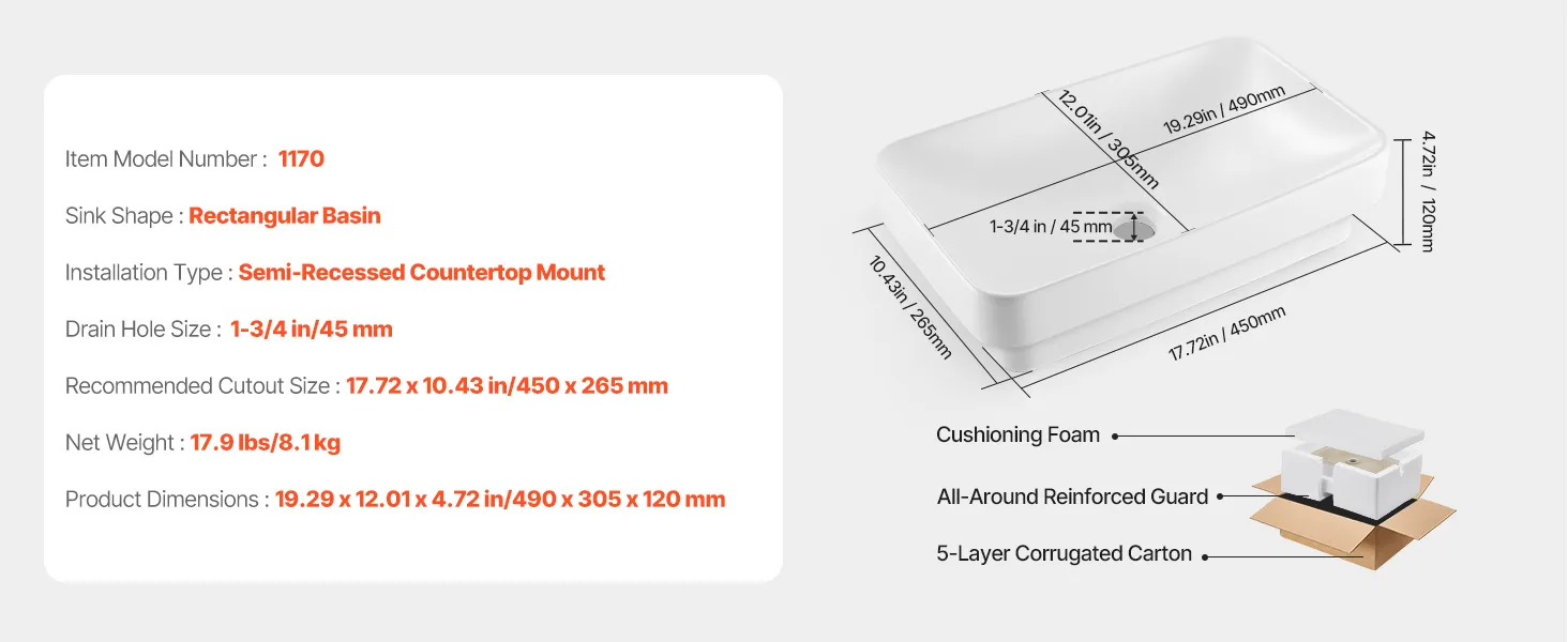 • Countertop Installation: Our semi recessed bathroom sink measures 19.29 x 12.01 x 4.72 in, recommended cabinet cutout 17.72 x 10.43 in. It features a 1-3/4 in drain, ideal for bathrooms in homes, hotels, or apartments (Faucet and drain not included)