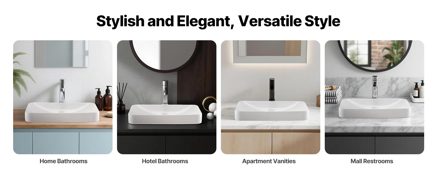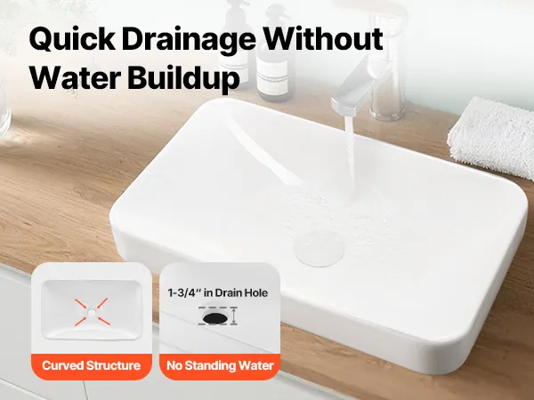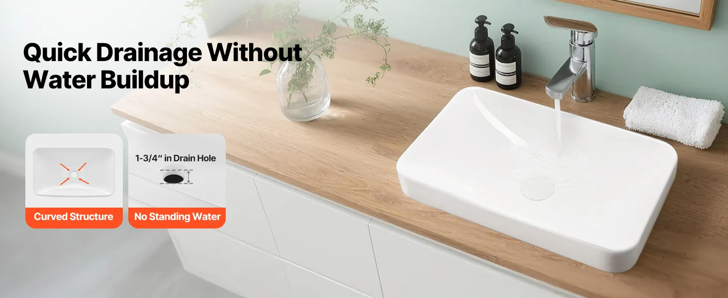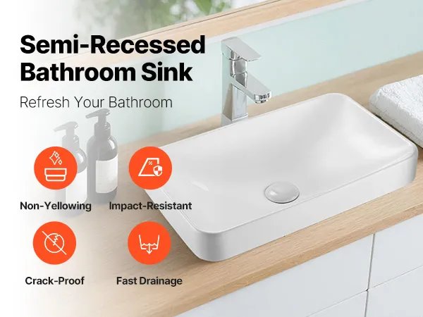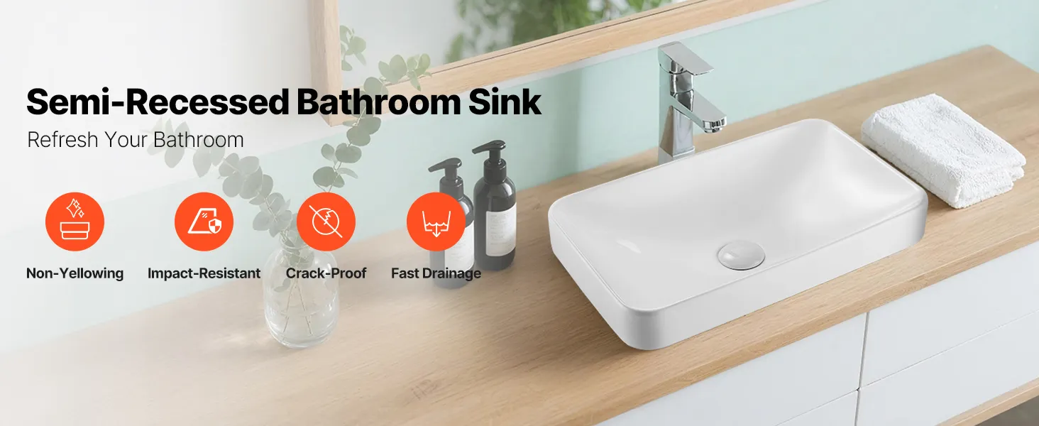 • Quick Drainage: Equipped with a rectangular basin and a wide drain hole, this bathroom semi recessed sink fits most standard pop-up drains. Its arched bottom design ensures fast water flow without buildup, keeping the sink dry and clean after every use
