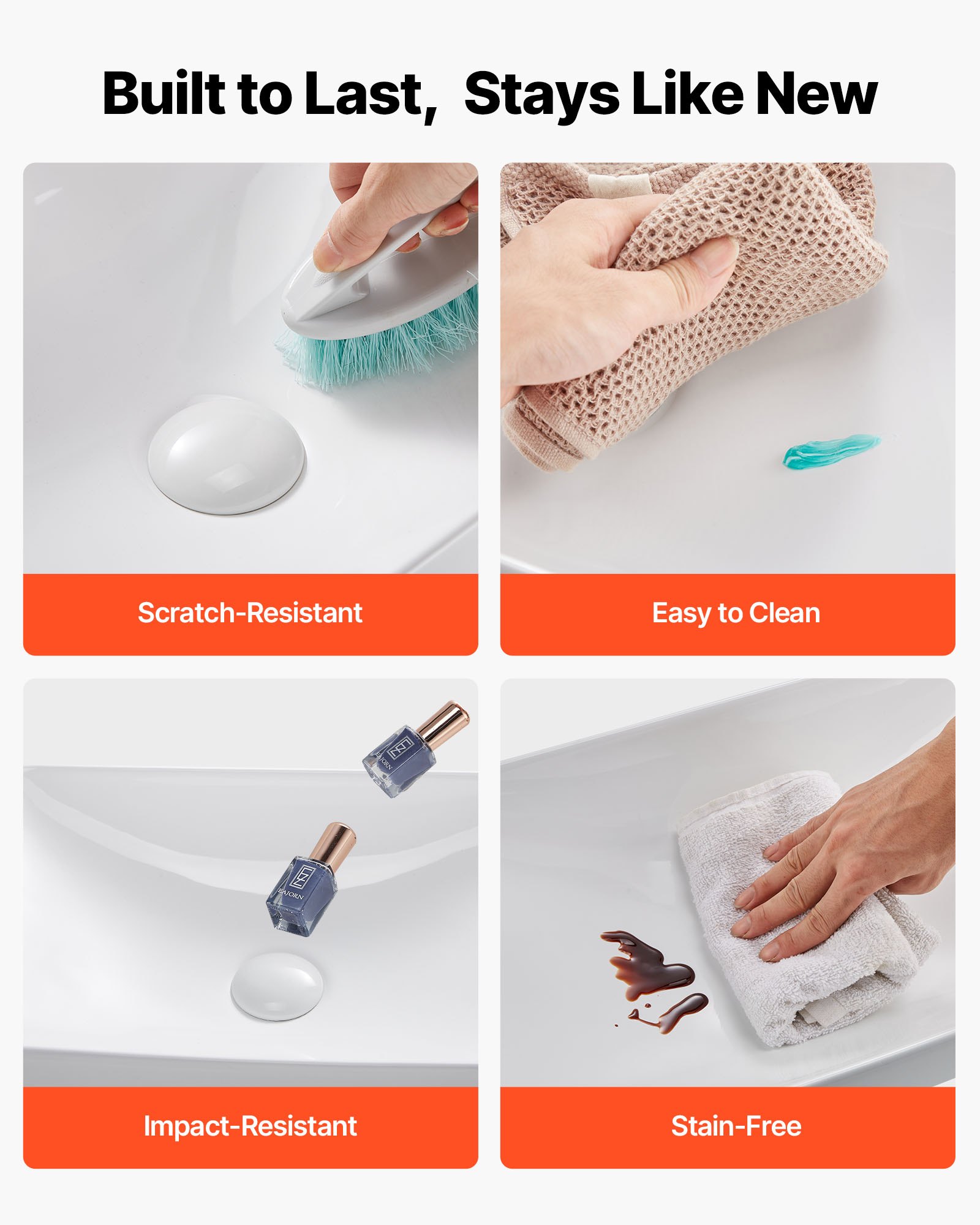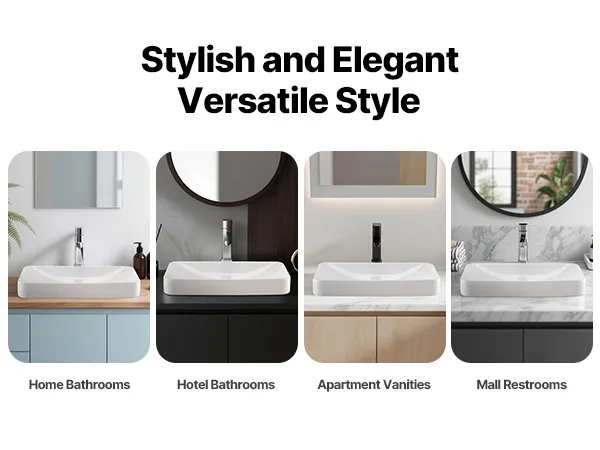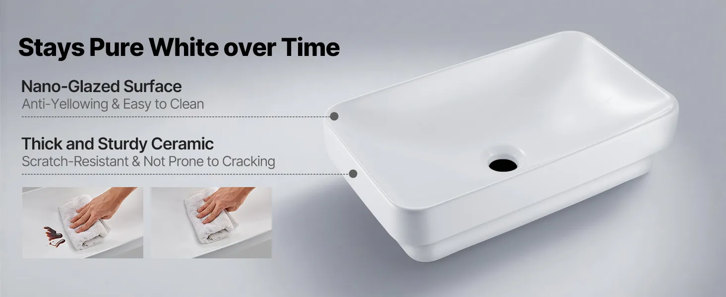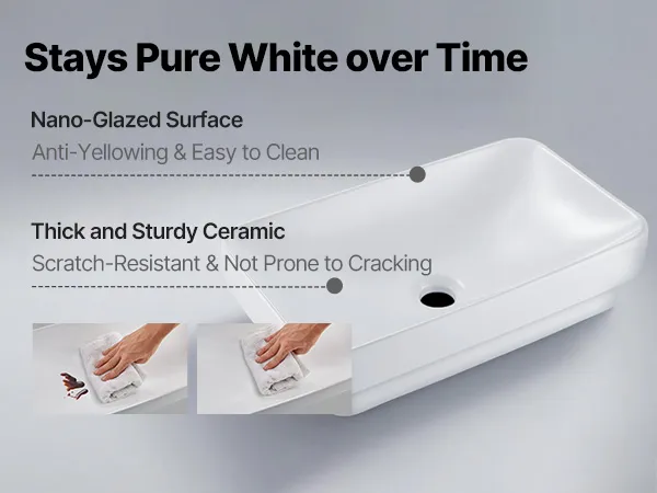 • Stain-Resistant Glaze: The ceramic bathroom sink adopts a nano-glazed smooth surface that resists yellowing and scratches. Its seamless finish reduces dirt buildup, makes cleaning easier, and keeps the sink looking bright white and fresh over time