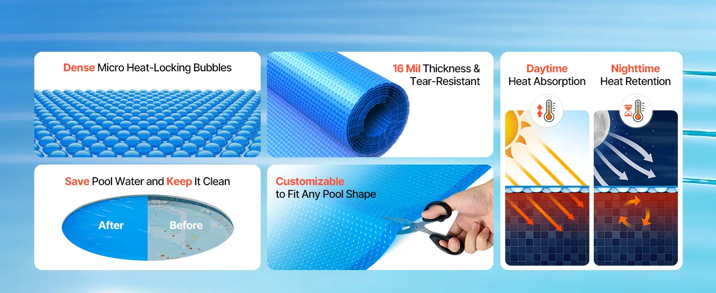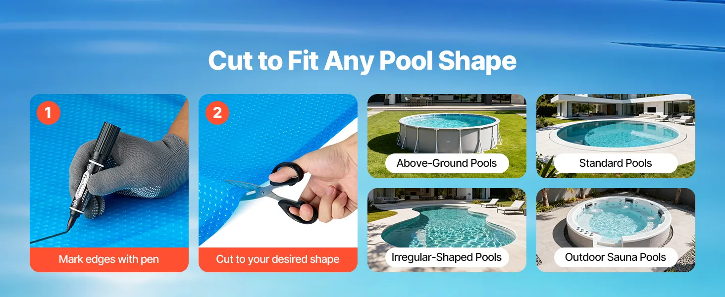 This solar pool cover can be easily trimmed to fit any pool shape, whether round, oval, or irregular. Its flexible design adapts to your pool, ensuring a snug fit and efficient heating.