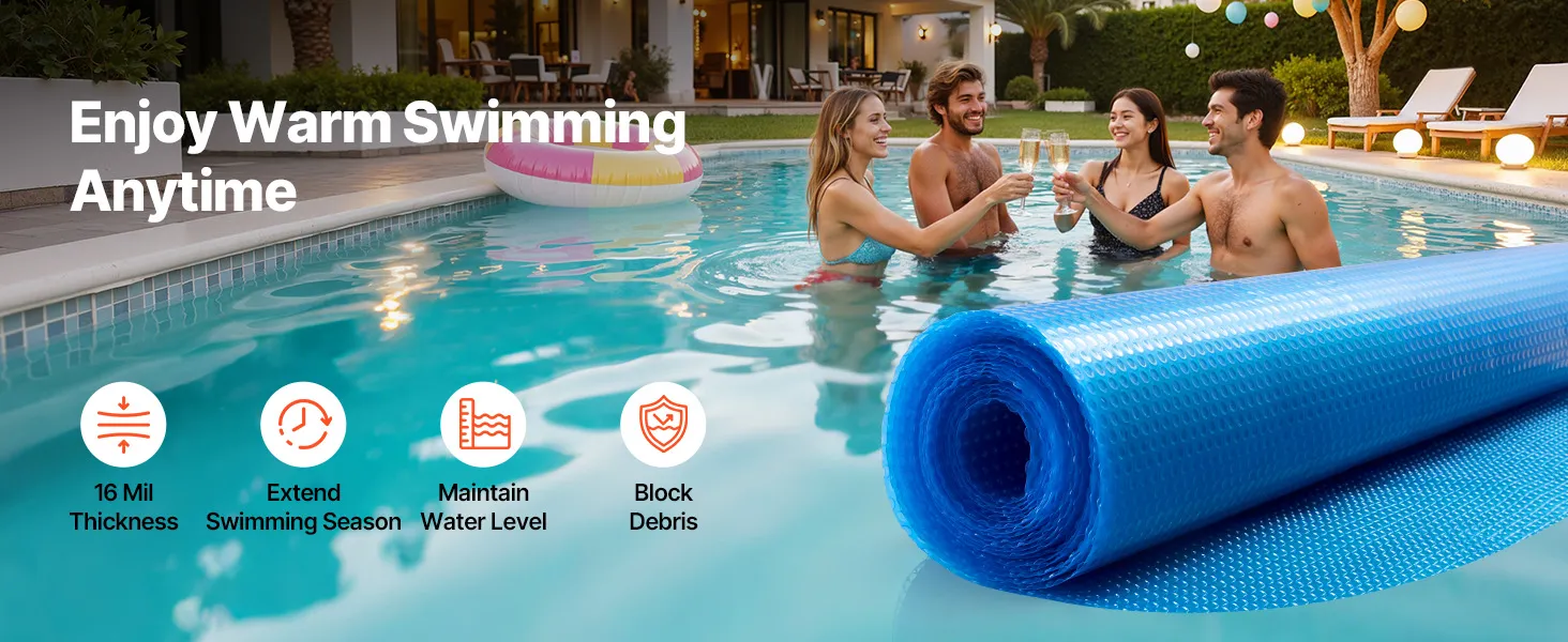 Extend your swimming season with our 18ft/5.49m solar pool cover. It helps raise water temperature and retains heat overnight. Made from durable 16 mil PE material, it reduces evaporation by 95%, minimizes refill needs, and keeps your pool clean.