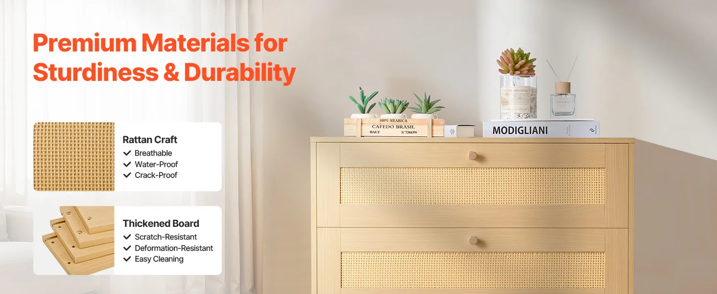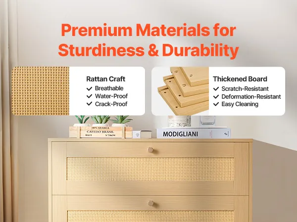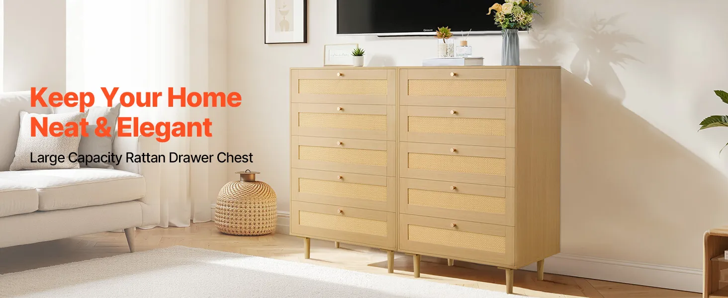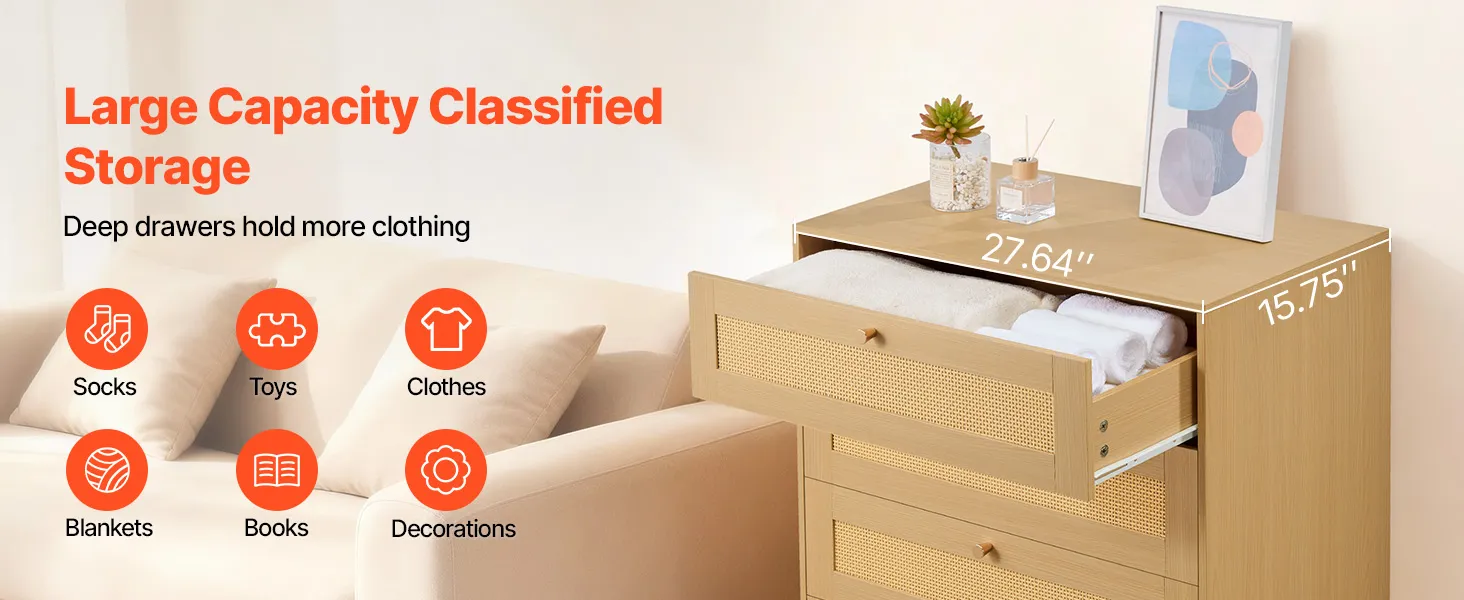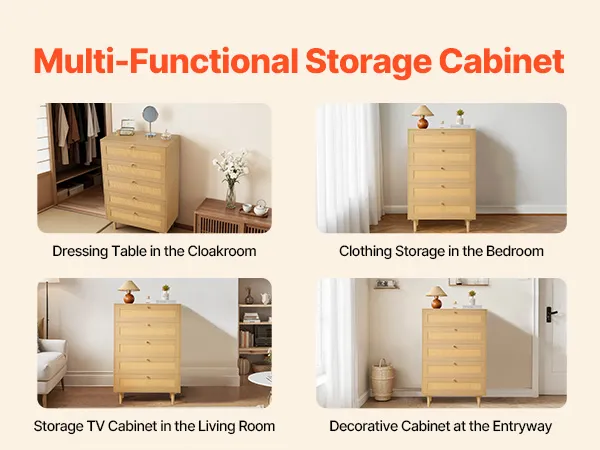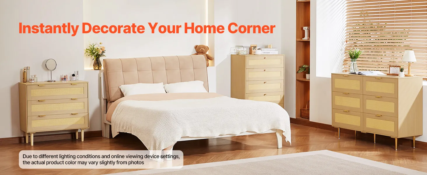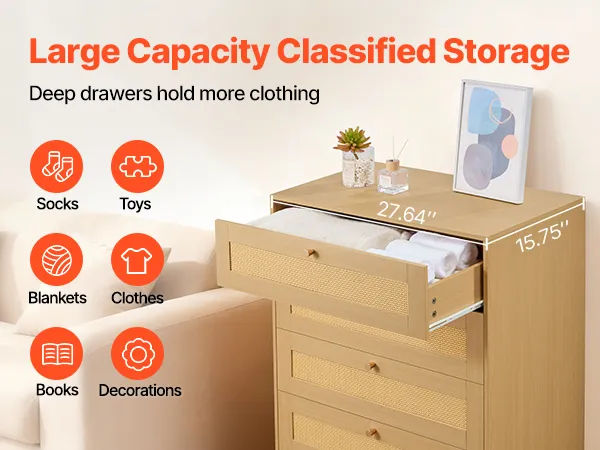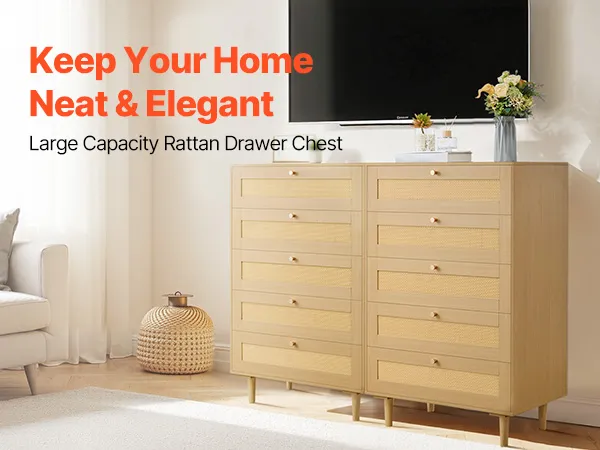 Our spacious rattan dresser provides multi-layer storage space. Featuring deeper and wider drawers, it can store a large amount of clothes and daily necessities in a classified manner. The top surface holds decorations or frequently used items, meeting diverse home organization needs.