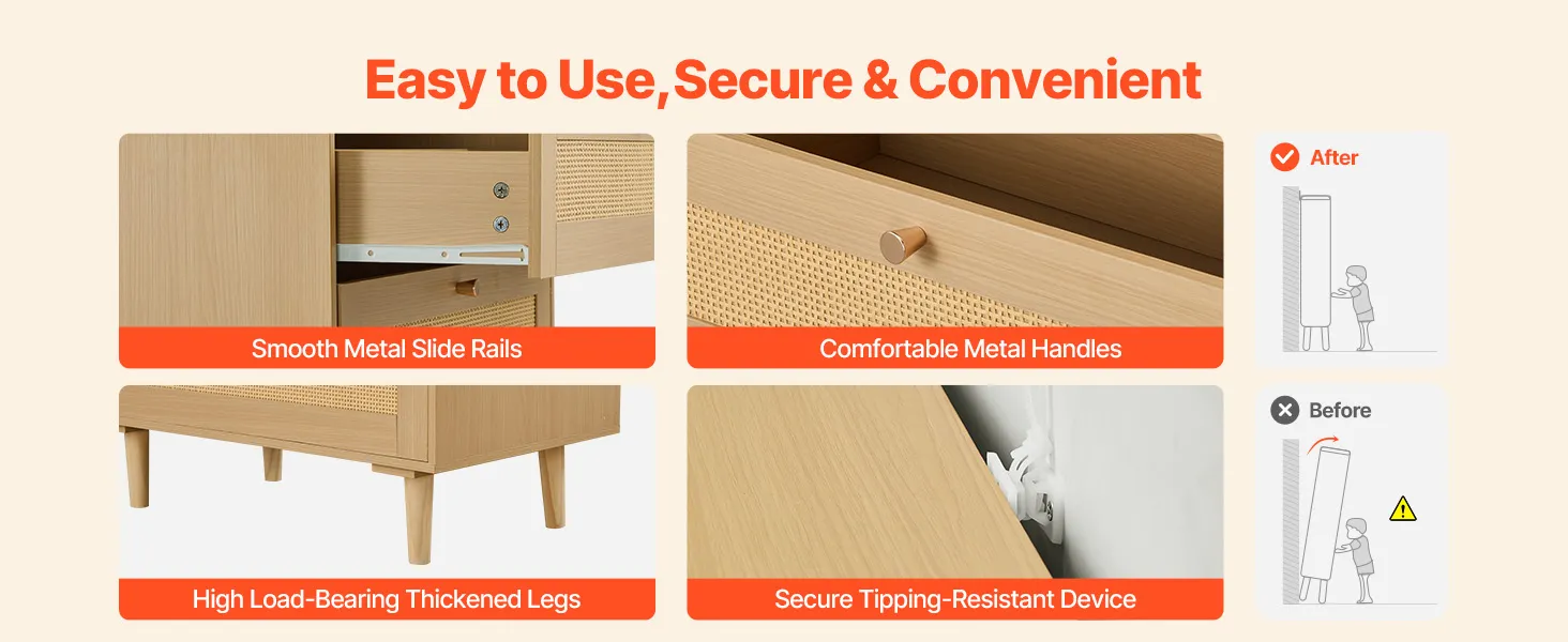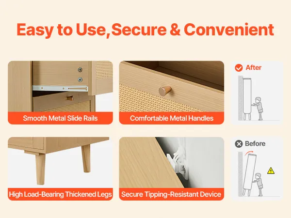 Our boho dresser comes with metal handles that provide a comfortable grip, paired with sliding rails that remain smooth when pushing and pulling. Its high-load-bearing legs and anti-tip device ensure reliable use, withstanding the wear of daily use, keeping it looking like new for a long time.