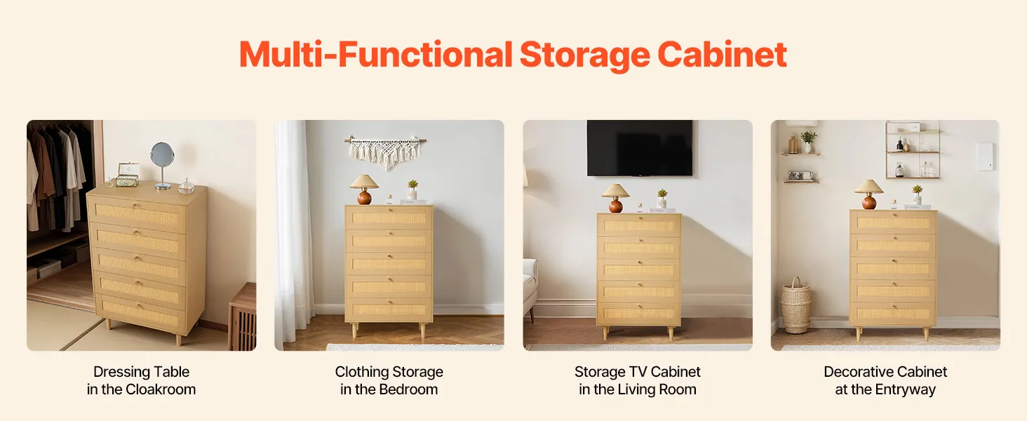 VEVOR 5 Drawer Rattan Dresser, Modern Closet Dresser for Bedroom, Natural Rattan Chest of Drawers with Metal Handles & Wooden Legs, Chest Clothing Organizer & Storage for Bedroom, Living Room, Hallway