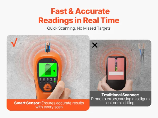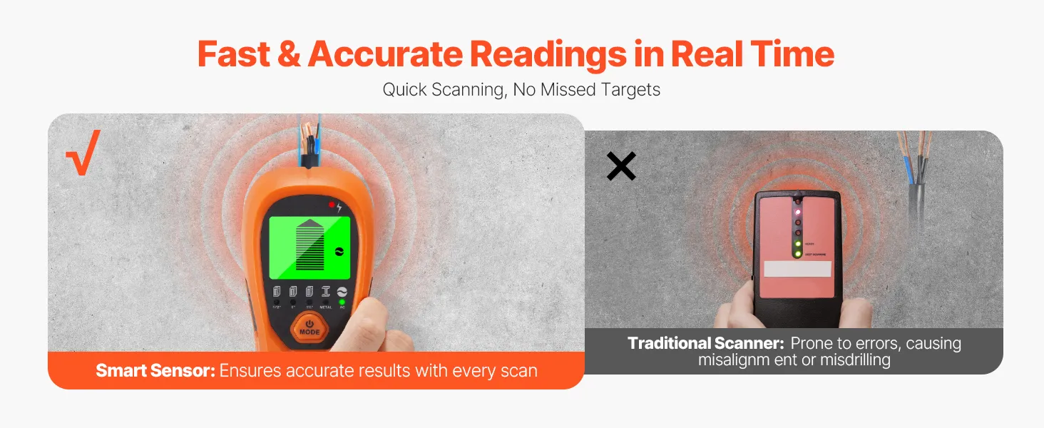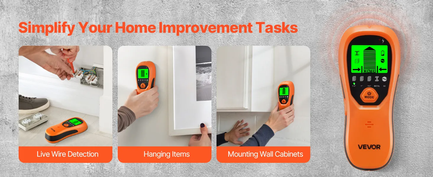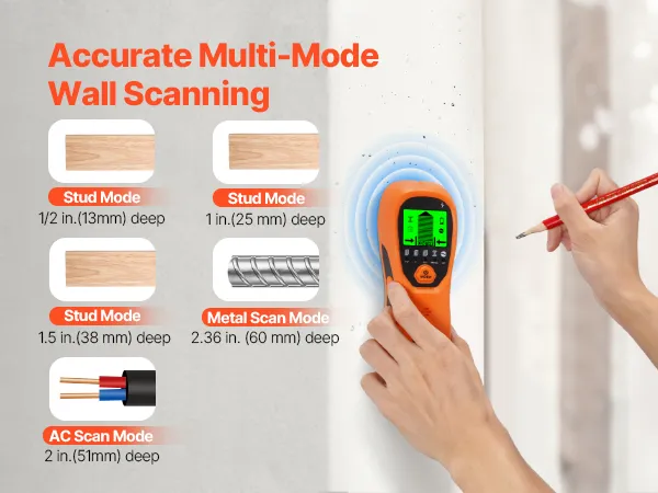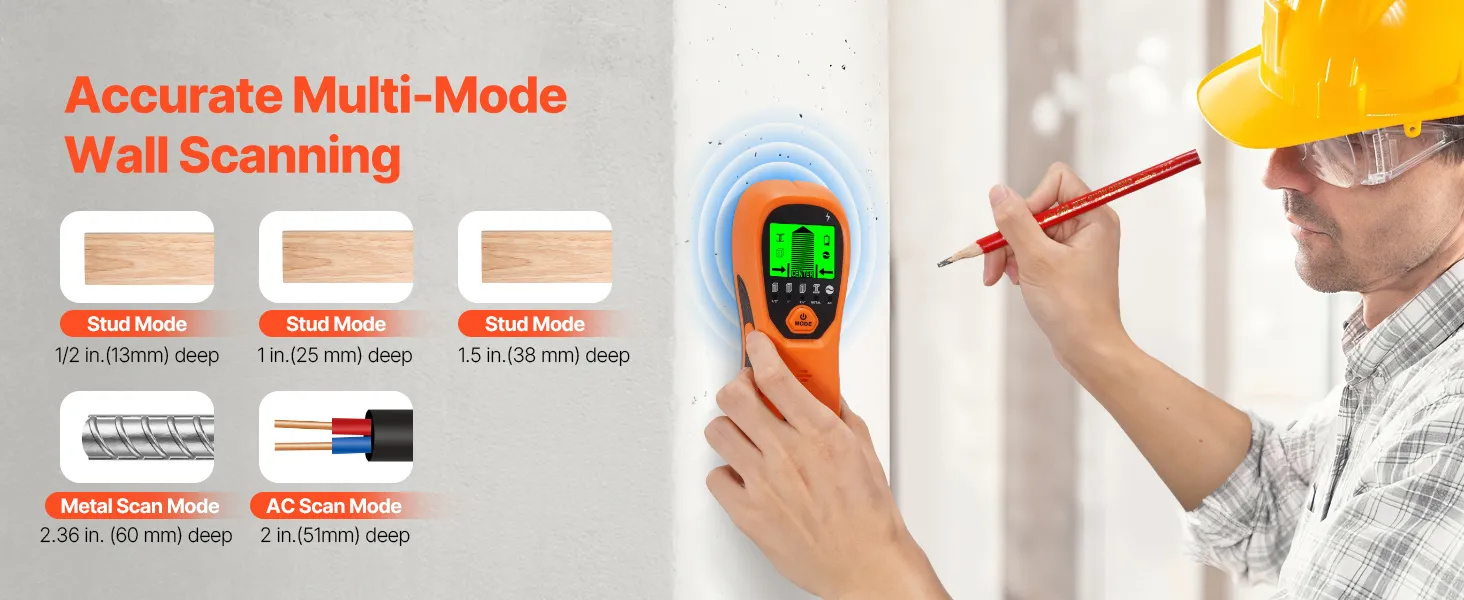 With 5 professional modes, this stud finder quickly detects hidden structures in various wall materials and depths. Easily switch between modes to scan for wood studs, metal, and wires, making it versatile for a wide range of home improvement tasks—saving time and increasing efficiency!