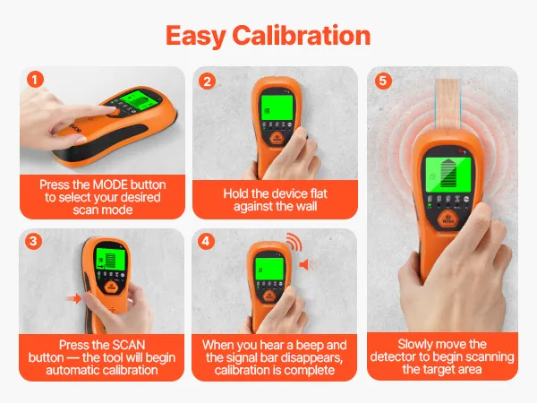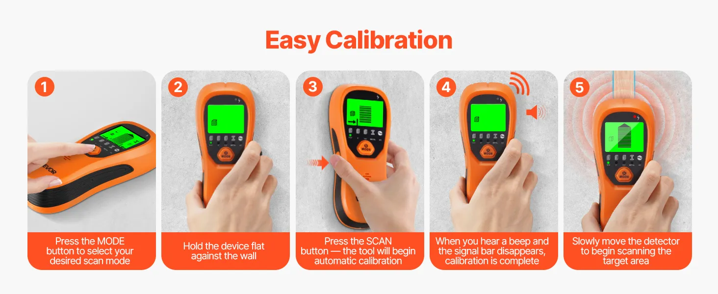 The wood stud finder features an intelligent calibration system. Simply press the MODE button after powering on, and it will calibrate automatically. Even first-time users can easily adapt, handling challenging environments like mixed materials or hollow walls with ease.
