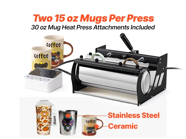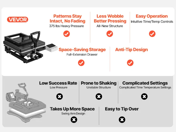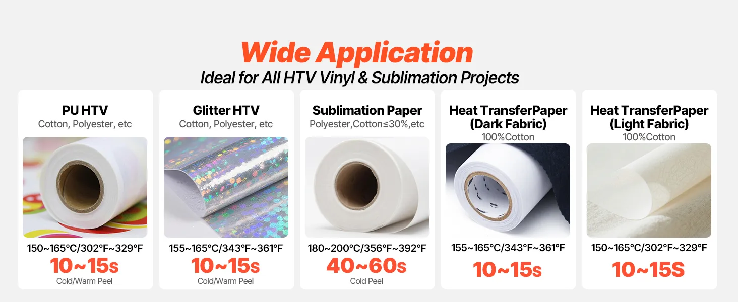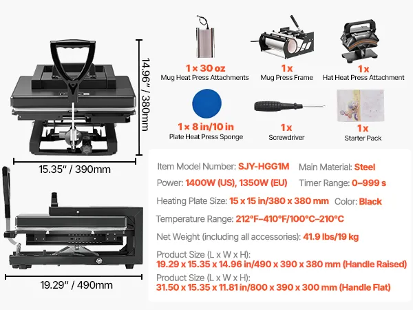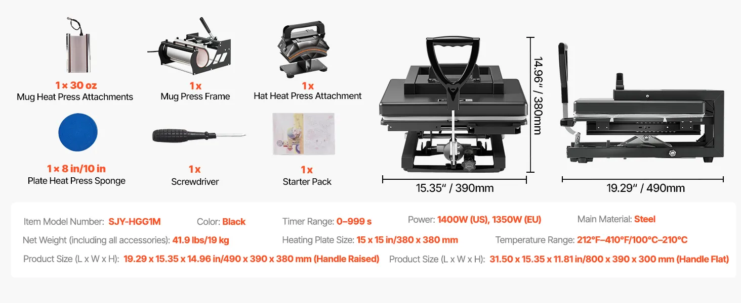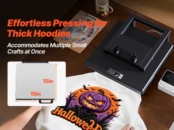 The 15 x 15 inch heat press with adjustable pressure provides precise control, ideal for materials like T-shirts and mugs. Achieve flawless heat transfer results effortlessly.