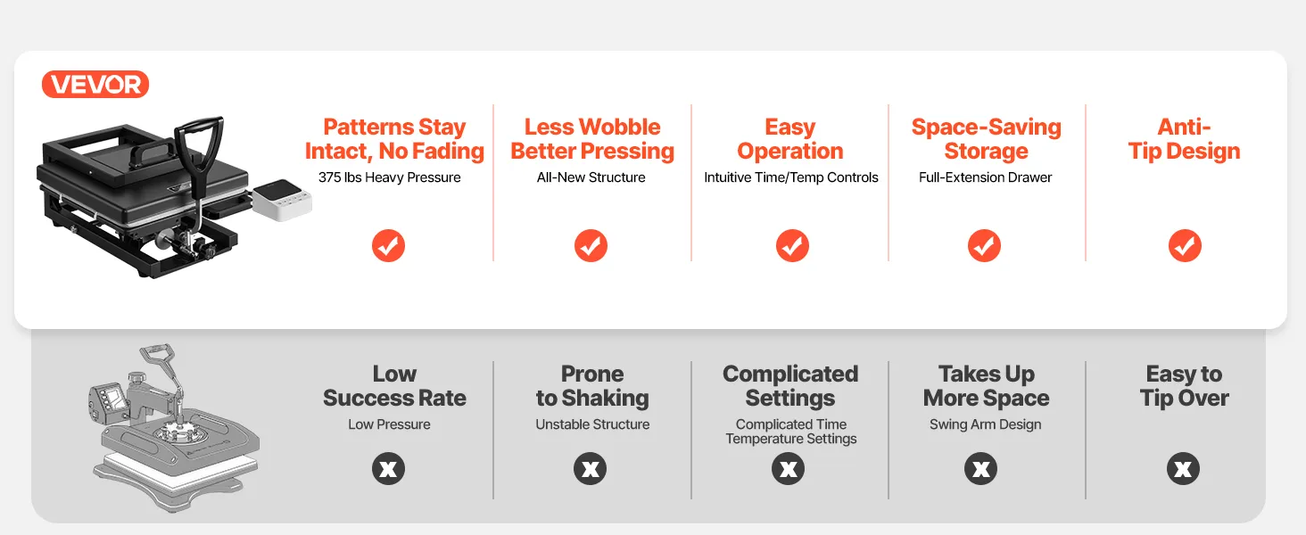 This heat press machine combines creativity and practicality, handling various pressing needs. Its upgraded pressure ensures clear results, while the easy-to-use control panel makes it beginner-friendly. Ideal for personalized items, DIY projects, and small businesses, it helps unleash creativity.