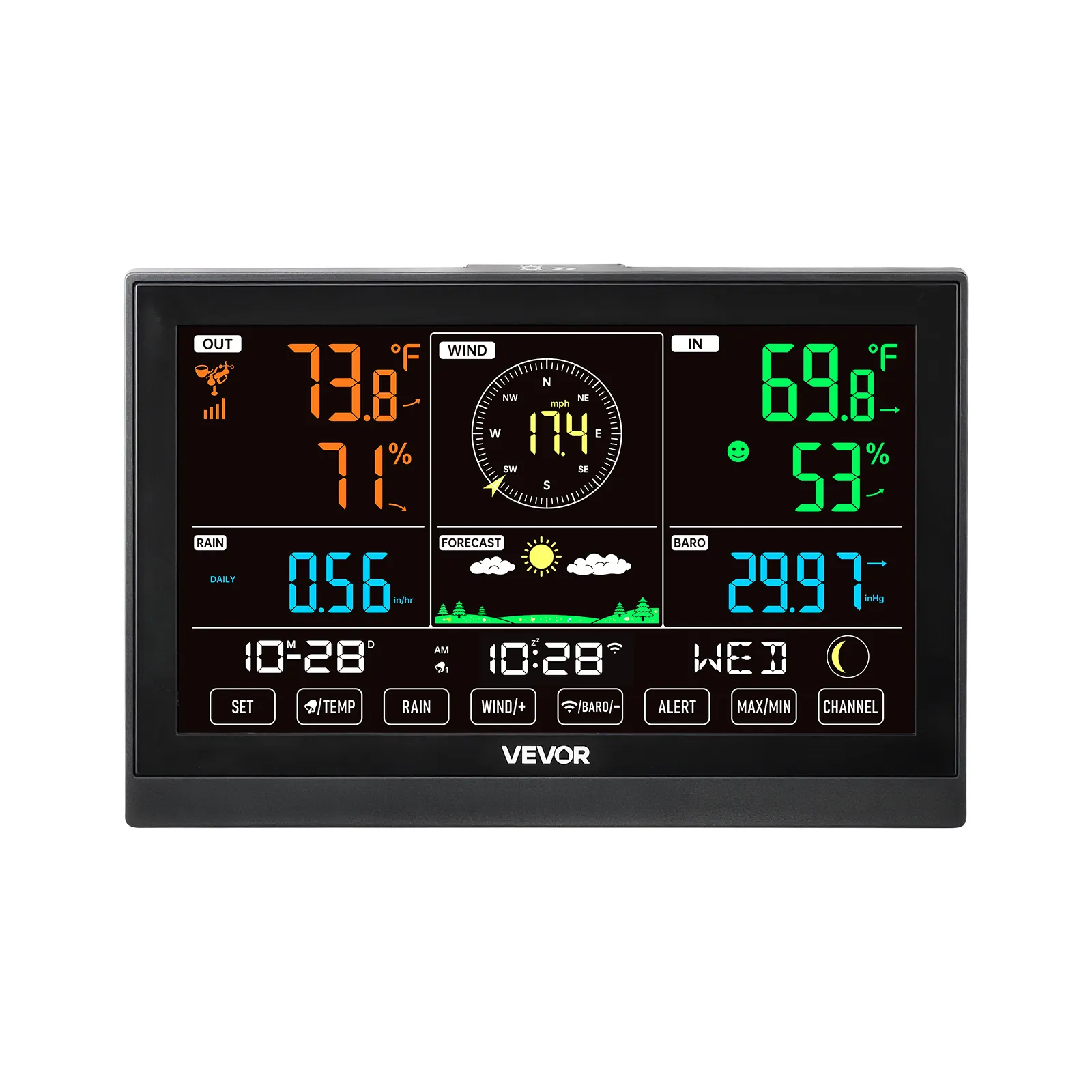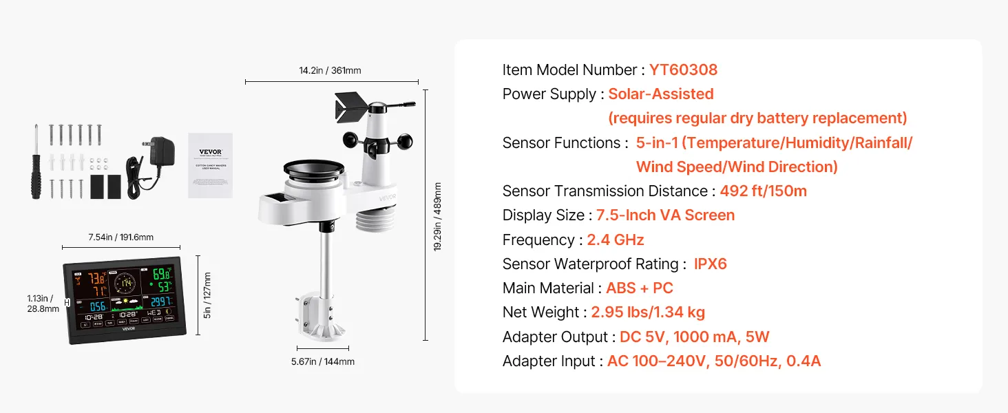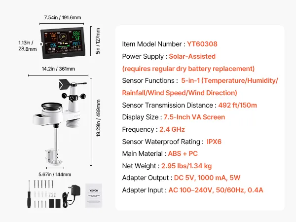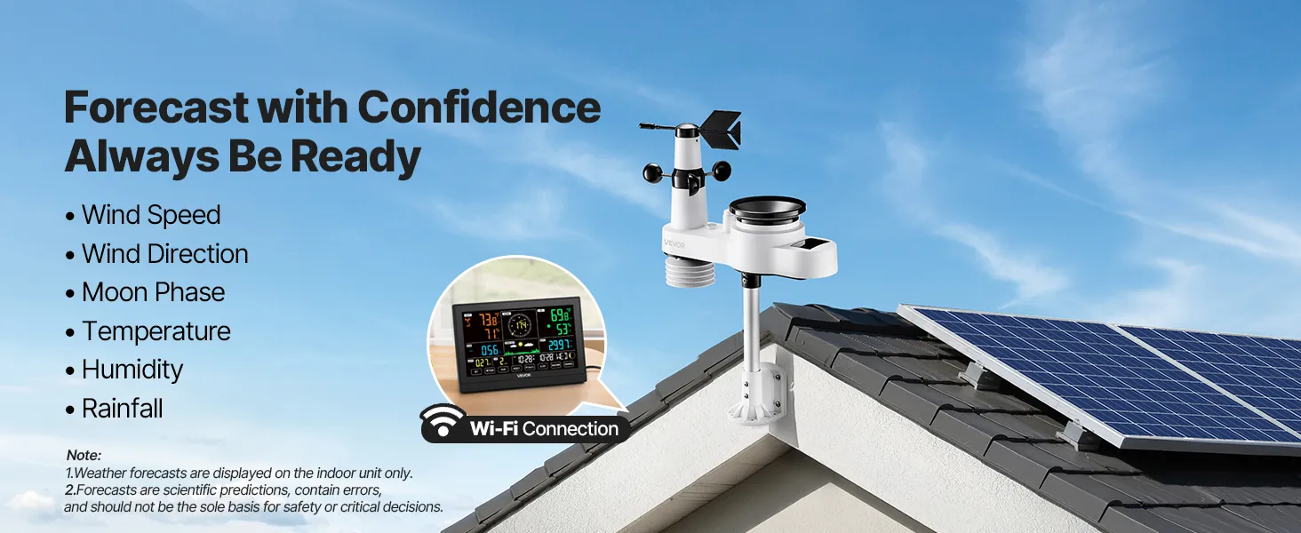 VEVOR 5-in-1 Wi-Fi Weather Station, 190.5 mm VA Display, Wireless Solar Powered Outdoor Sensor, Rain Gauge, Indoor Outdoor for Weather Forecast, Wind Speed Direction, Temperature, Humidity, Rainfall