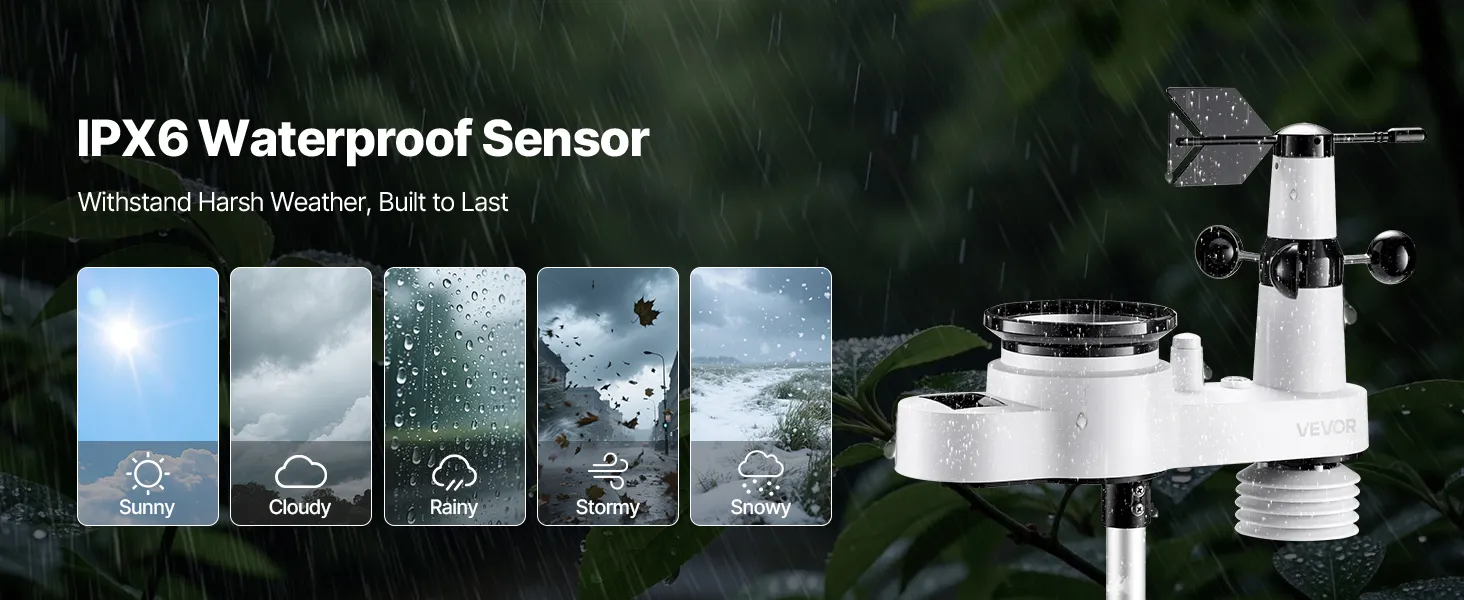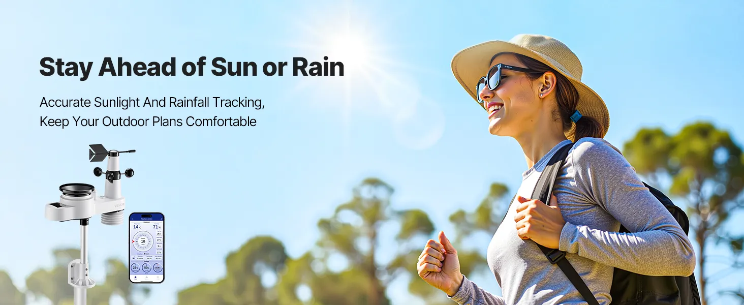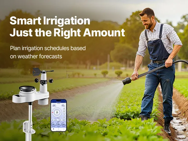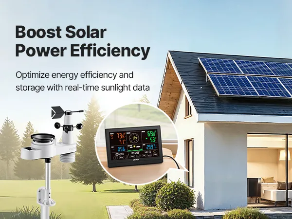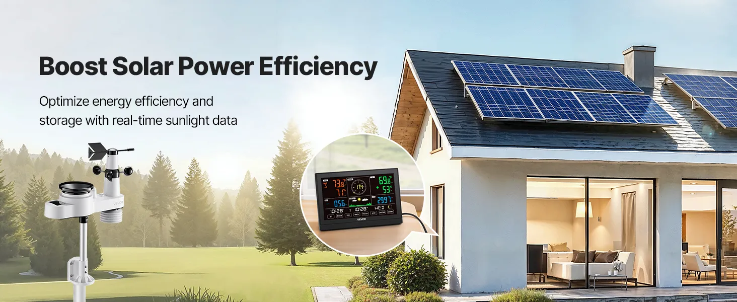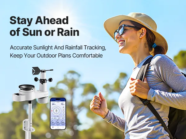 Our wireless weather station monitors temperature, humidity, rainfall, wind speed, and wind direction—all data at a glance with 7.5 in display. With a 492 ft (150 m) wireless transmission range and IPX6 waterproof outdoor sensor, it fits outdoors and is efficiently powered by solar panels.