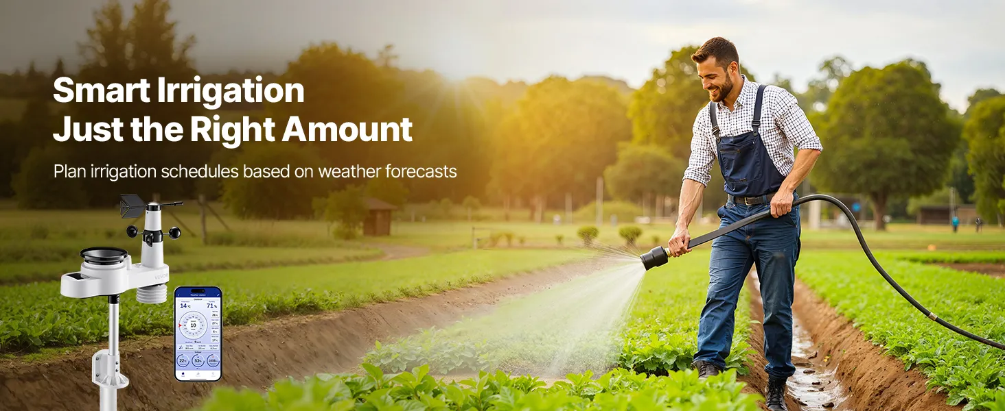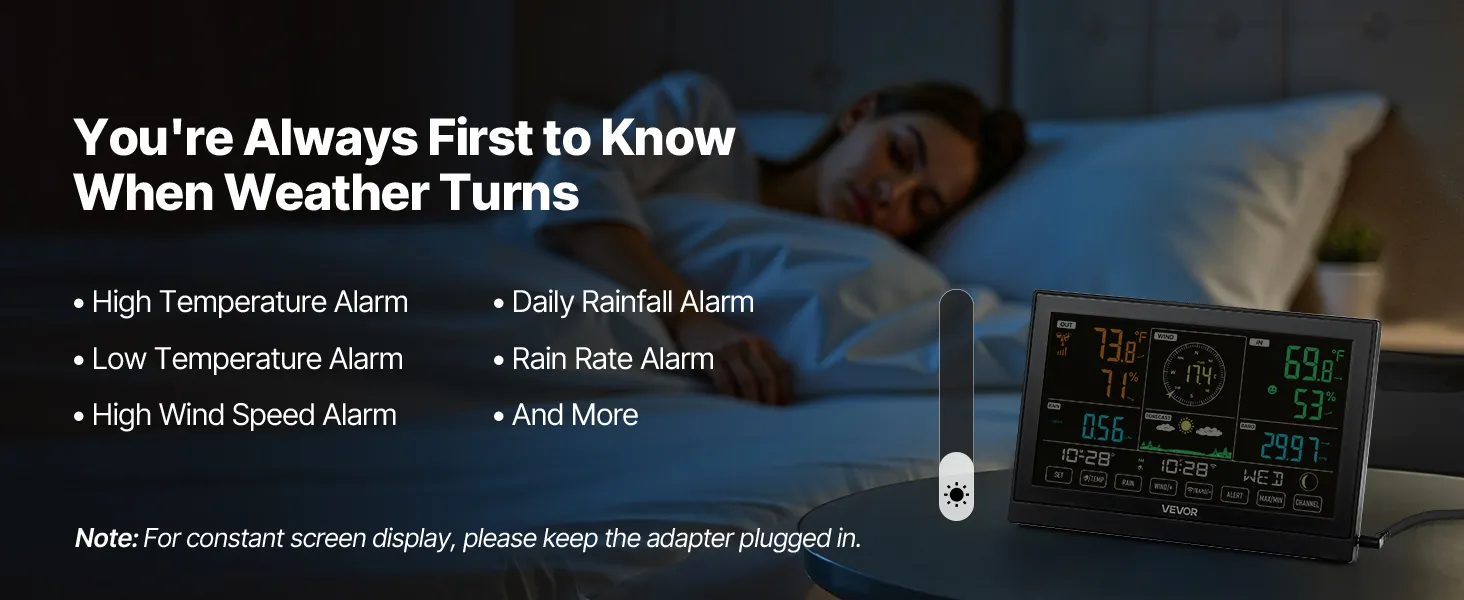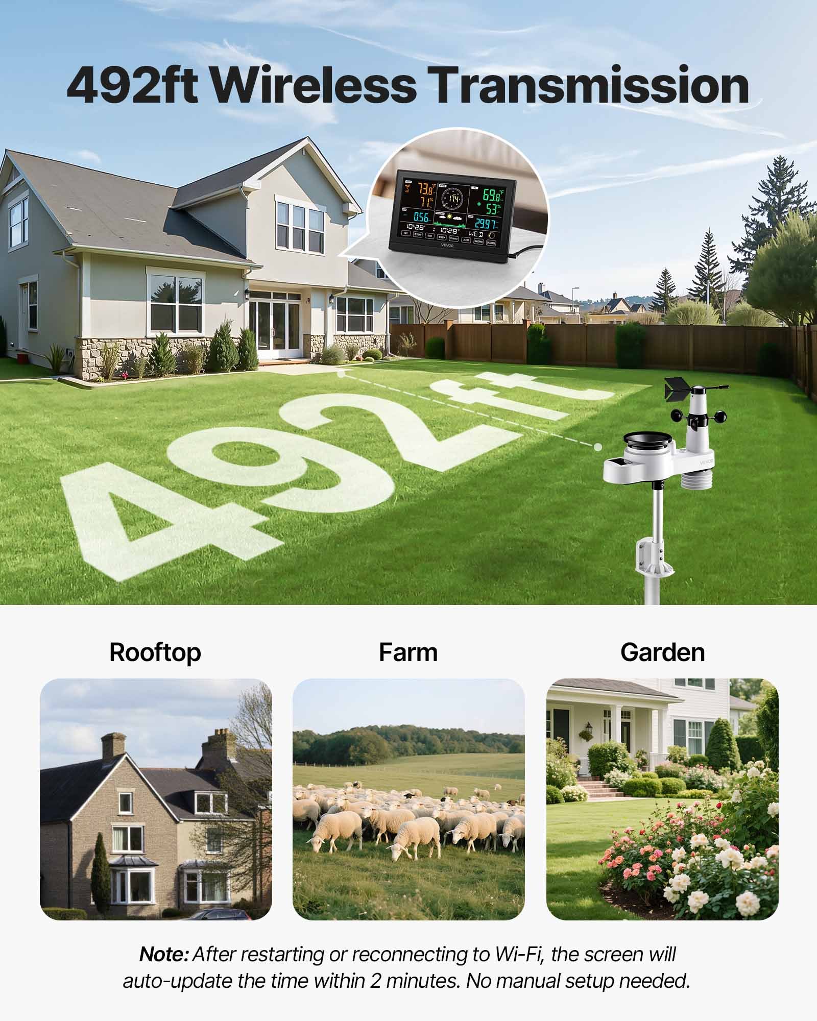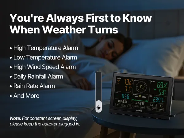 Our wireless weather station monitors temperature, humidity, rainfall, wind speed, and wind direction—all data at a glance with 7.5 in display. With a 492 ft (150 m) wireless transmission range and IPX6 waterproof outdoor sensor, it fits outdoors and is efficiently powered by solar panels.