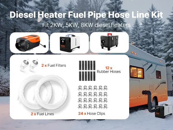 This 196.9 inch / 5000mm diesel heater fuel pipe hose line kit includes 2 fuel lines, 2 filters, 24 clips, and 6 hoses. Designed for quick installation and compatibility with most 2kw/5kw/8kw diesel heaters, its durable material performs reliably under high heat and outdoor use.