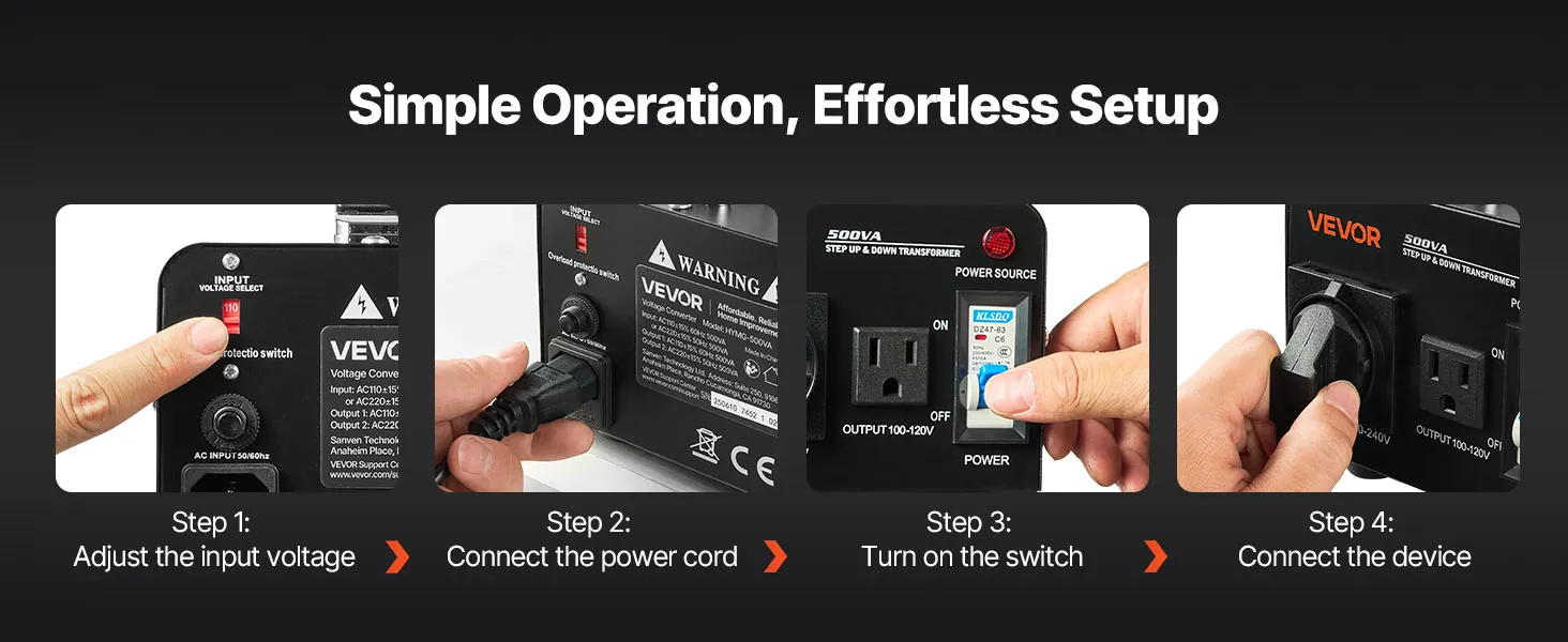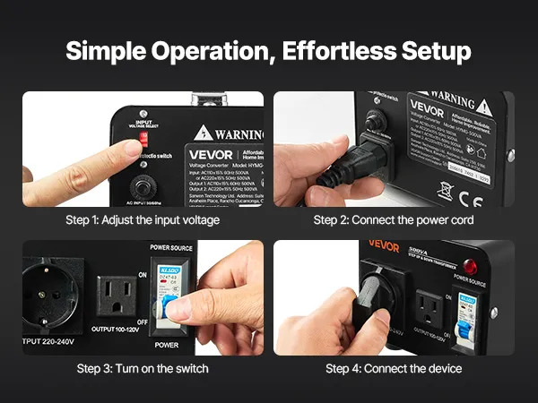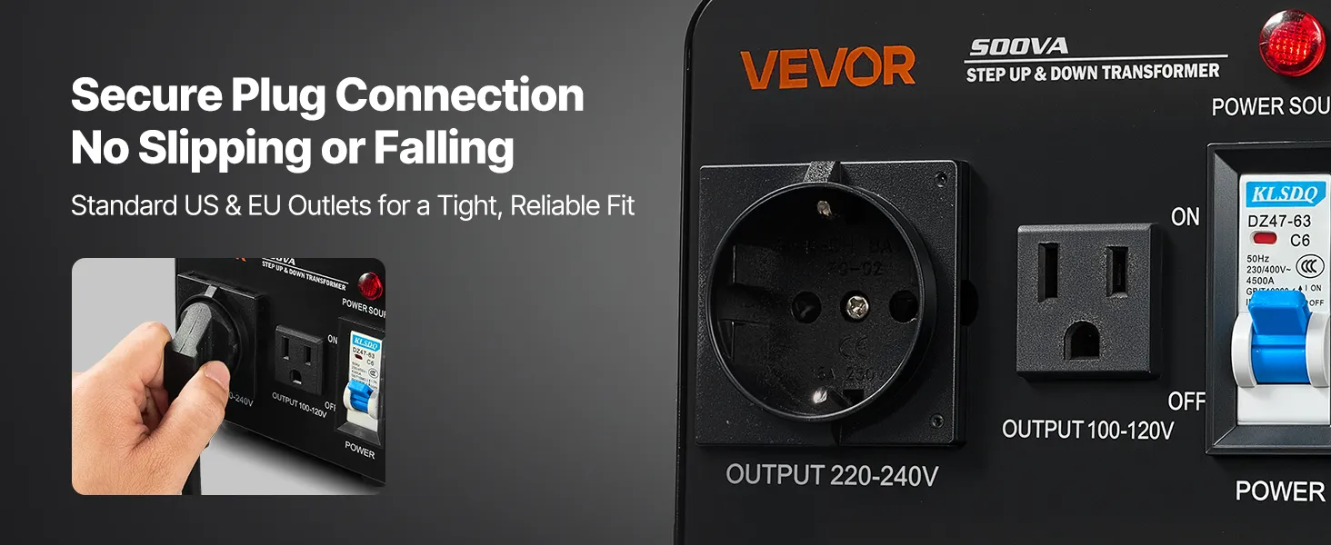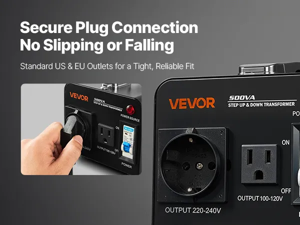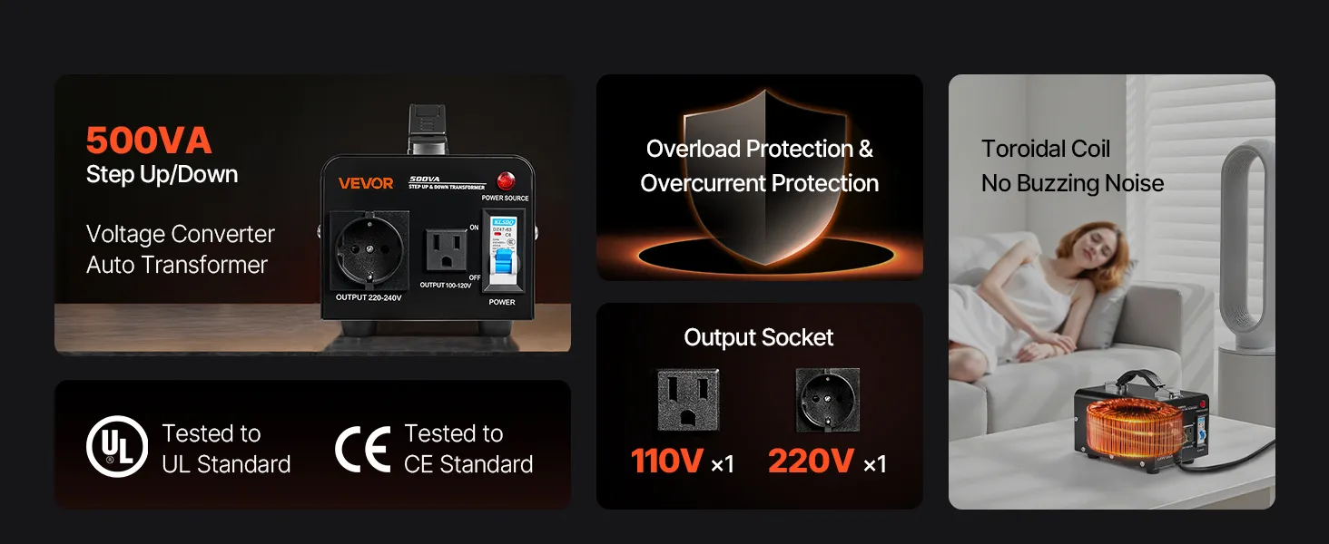 • 500VA Voltage Converter Transformer: Includes two AC outputs—one standard US output socket and one EU output socket. For optimal results, choose a step up down power converter rated at least 40% higher than your device’s total wattage
