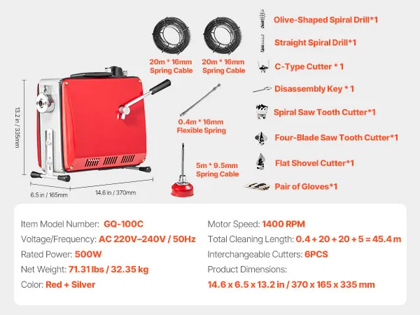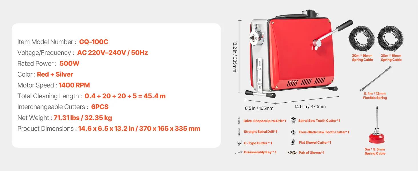 • 6 Interchangeable Cutters: Equipped with a versatile set of cleaning heads that switch easily to handle different types of blockages. From small daily clogs to stubborn blockages, our pipe cleaning machine handles them with speed and efficiency