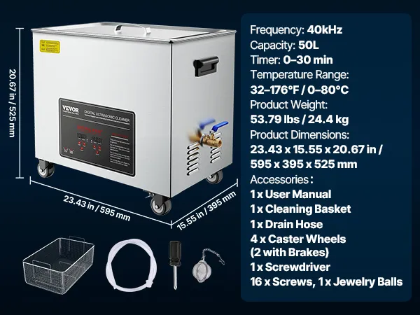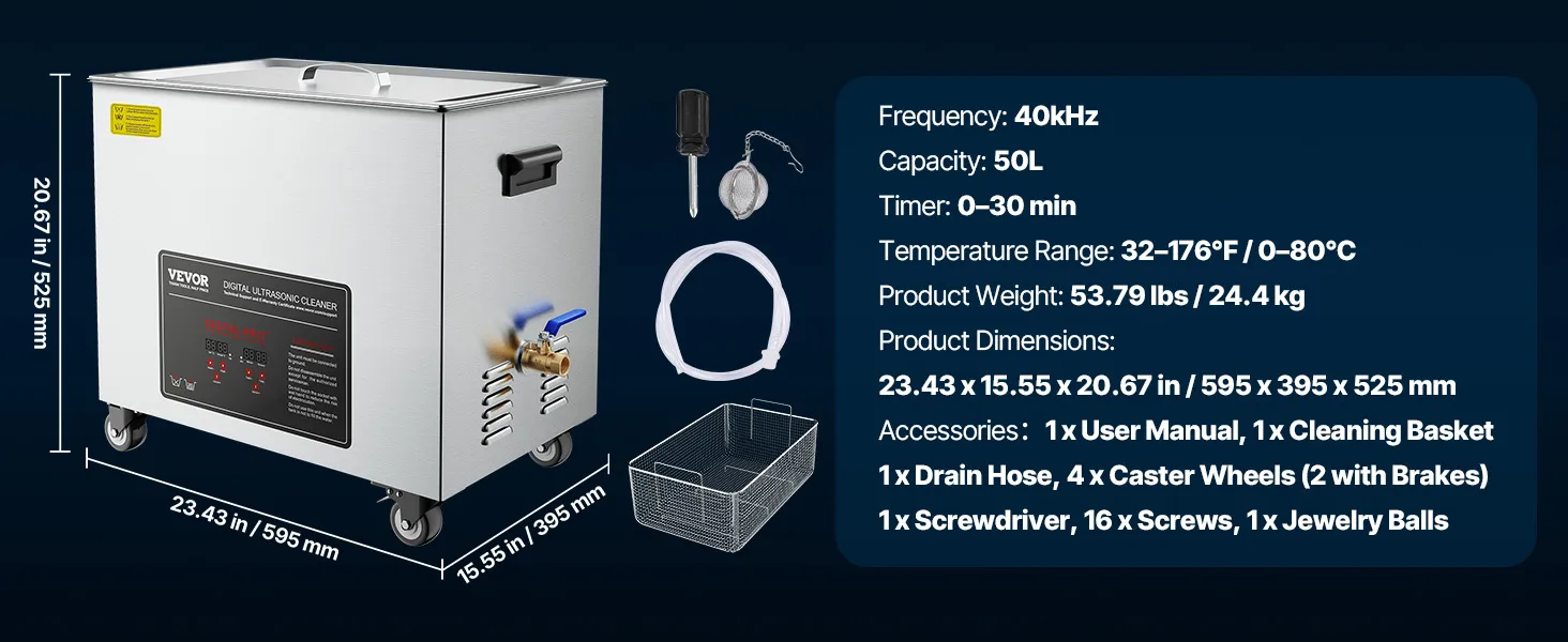 VEVOR 50L Ultrasonic Cleaner, Professional Ultrasonic Cleaner Machine with Cleaning Basket & Digital Display, 840W Stainless Steel Large Cleaning Machine with Wheels for Industrial Parts, Carburetors