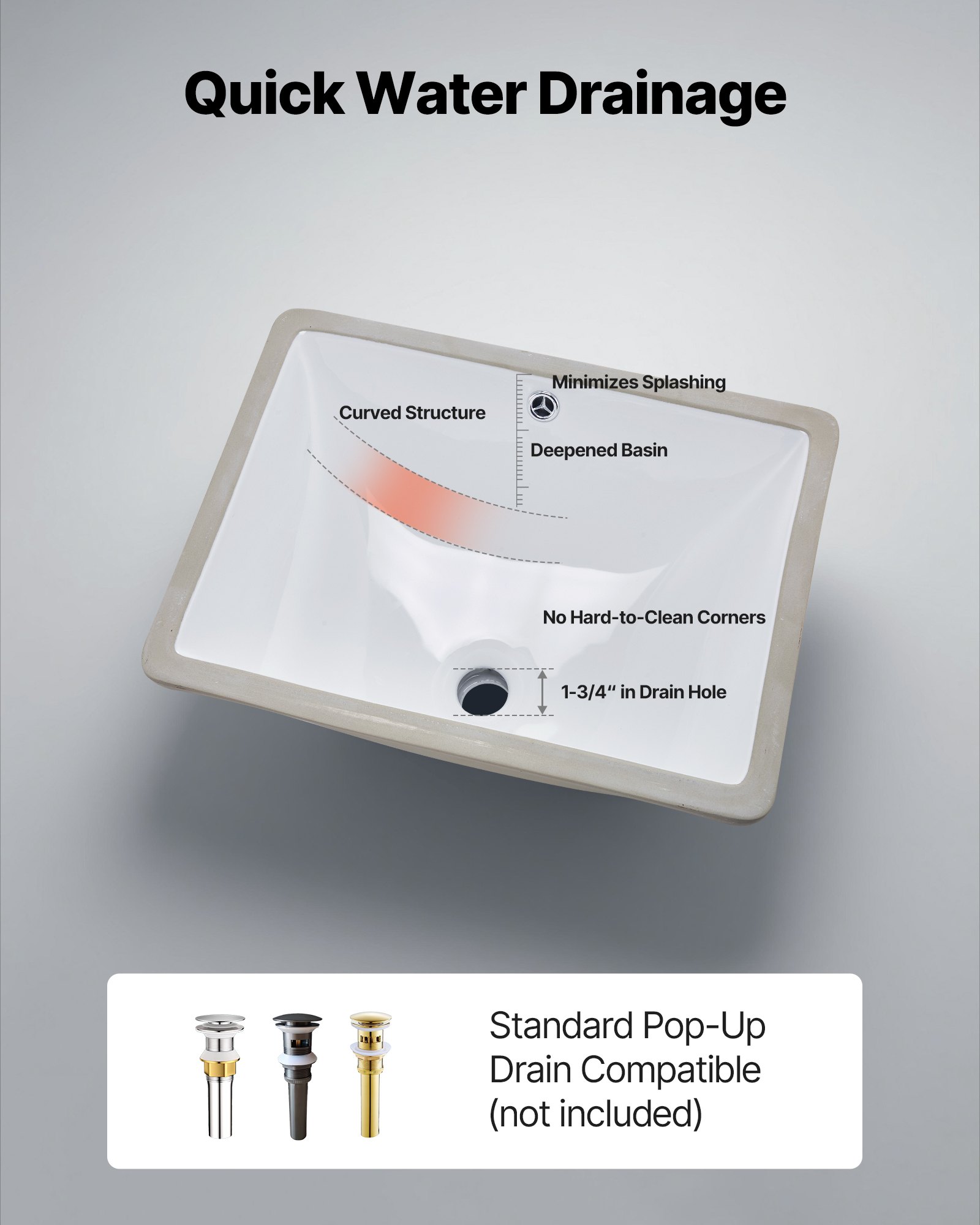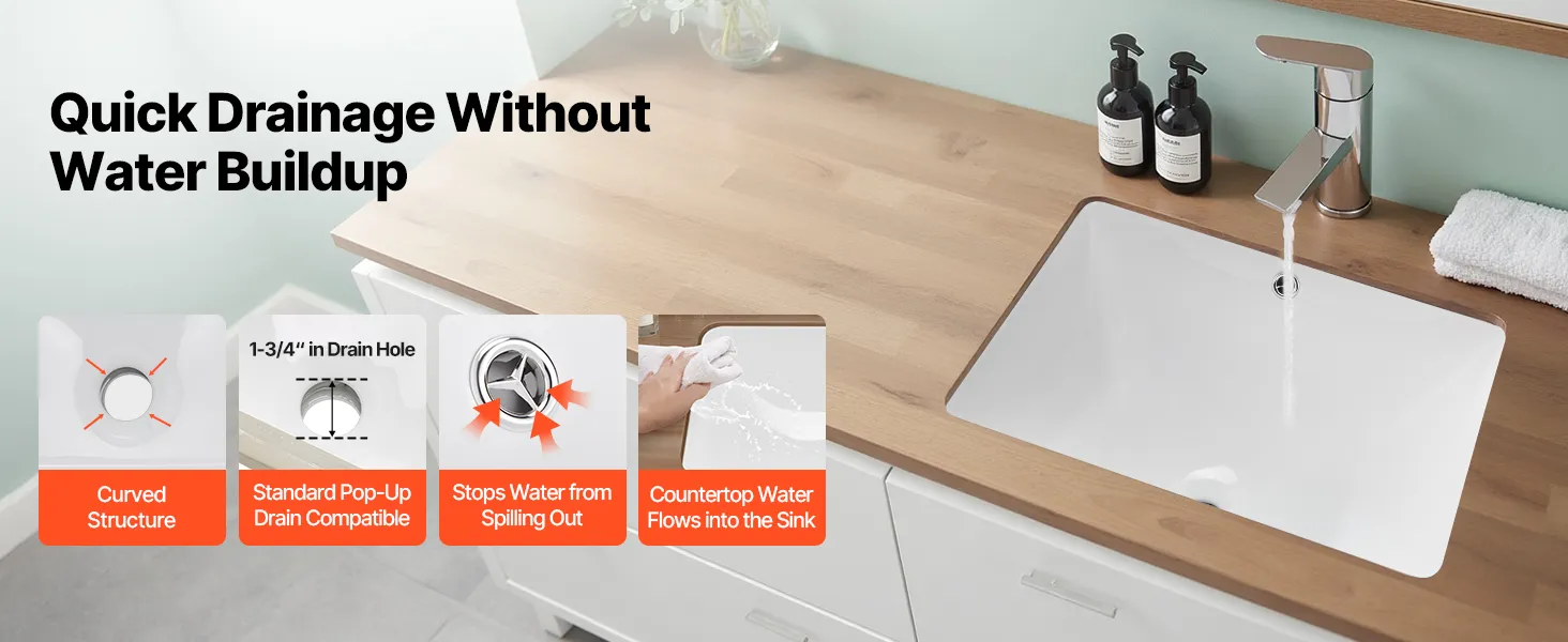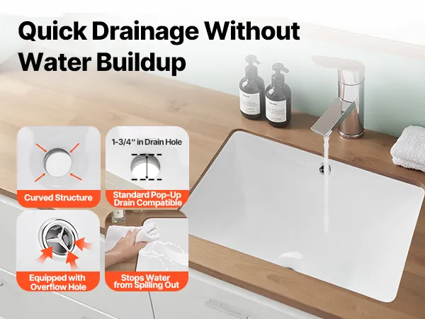 Designed with a curved bottom and wide drain hole, the bathroom undermount sink supports water flowing out smoothly with no water pooling left. It resists odor and keeps the sink clean and dry, delivering a more comfortable, efficient washing experience.