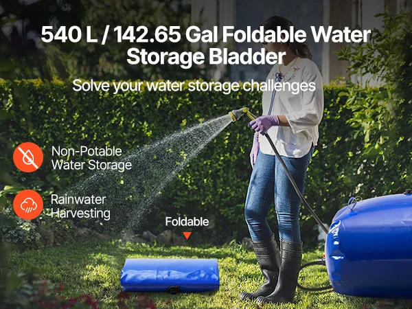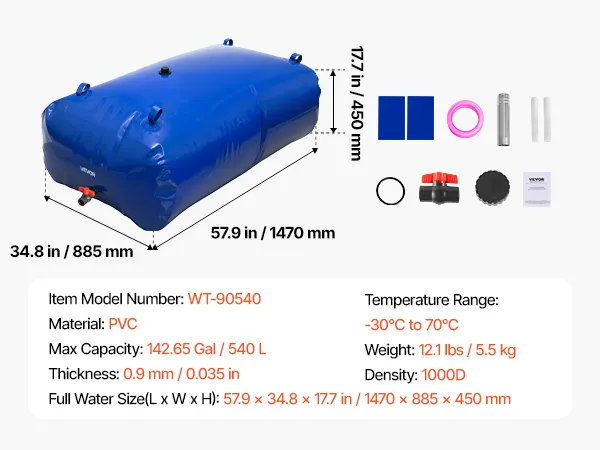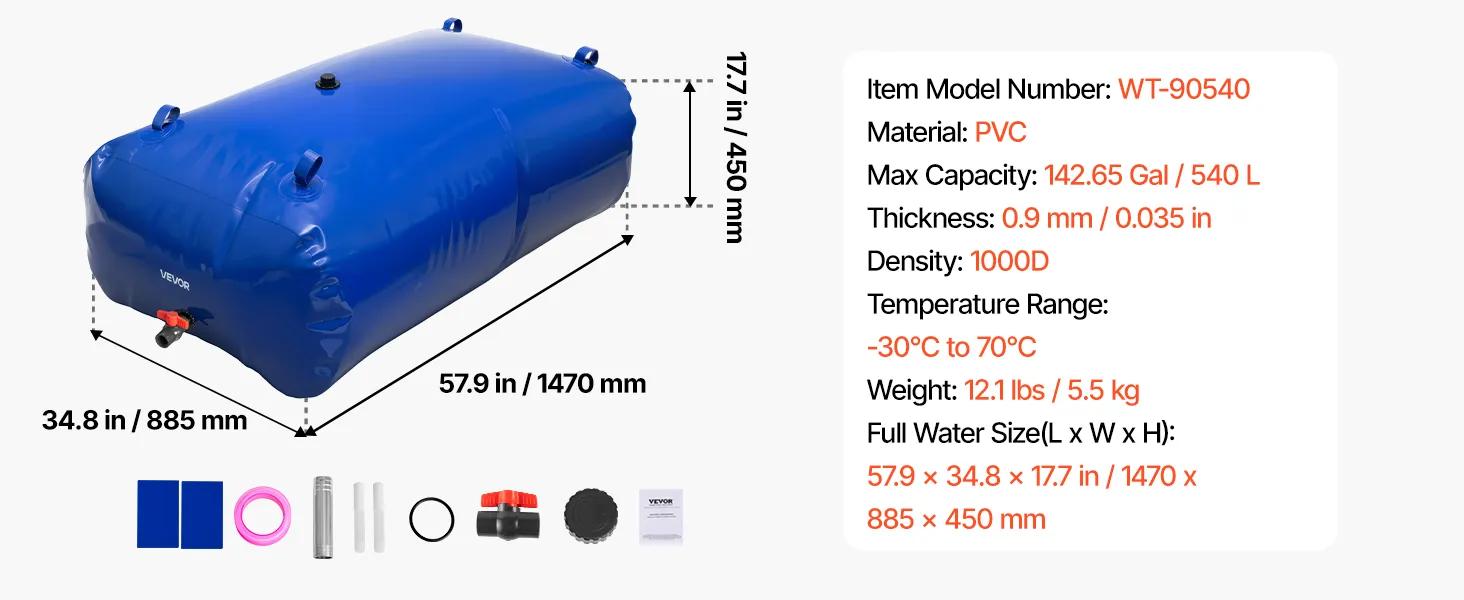With a capacity of 142.65 gallons, this collapsible water tank features durable 1000D double-layer PVC material. Its strong sealing and leak-proof design ensure safe and effective water use. Suitable for outdoor activities, home use, garden irrigation, and emergency water supply.