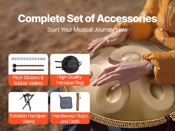 Our hand pan drum comes with a portable carrying case, which is lightweight and easy to carry, providing effective dust and impact protection. With a foldable drum stand, which has a stable structure and takes up no space when folded, it allows you to play anytime and anywhere.