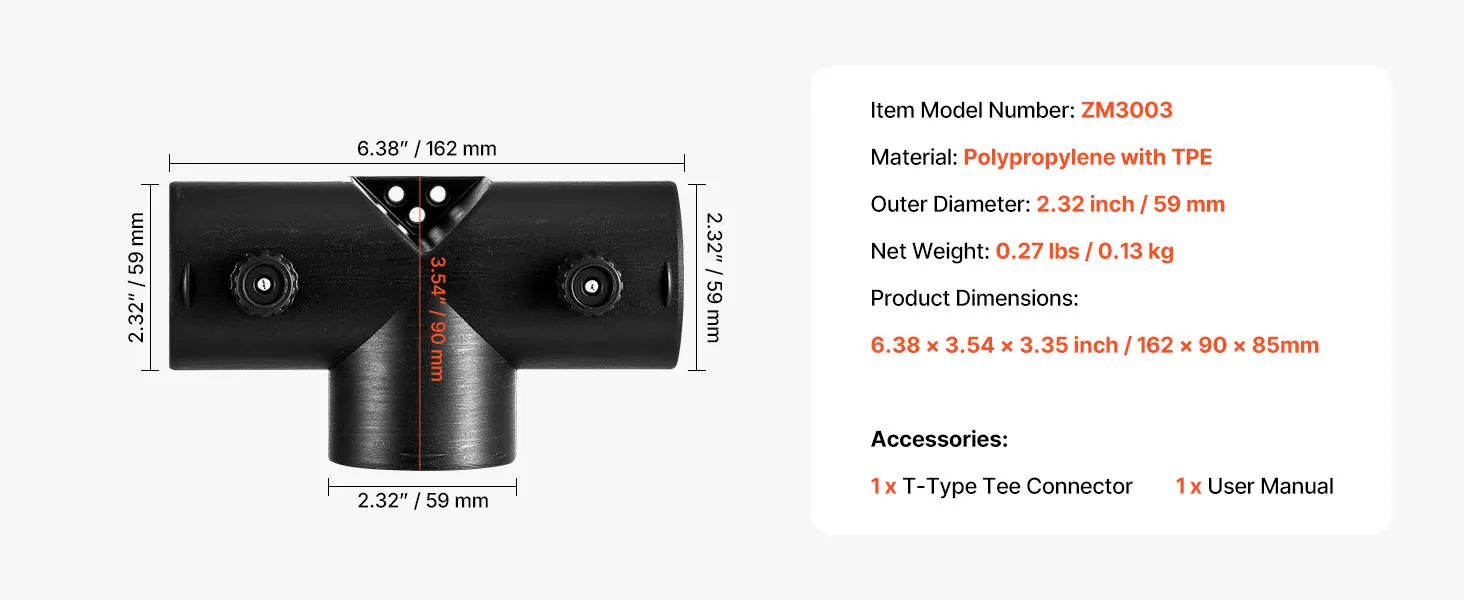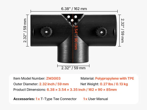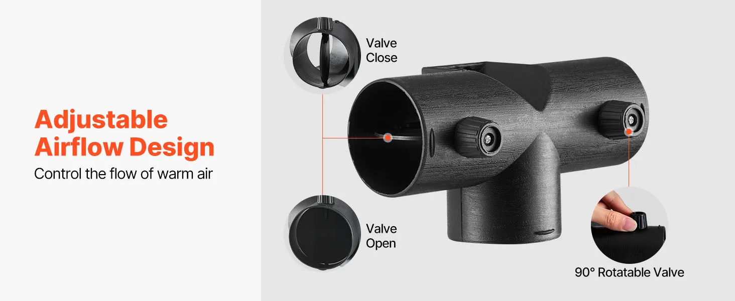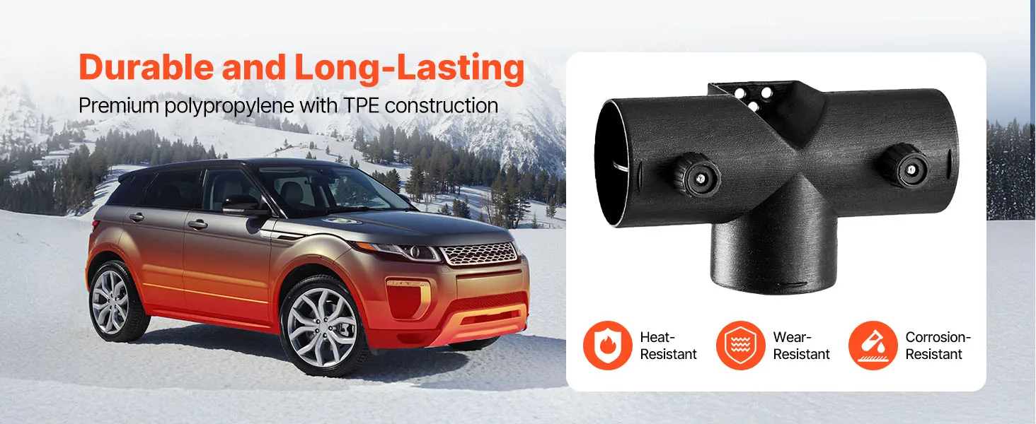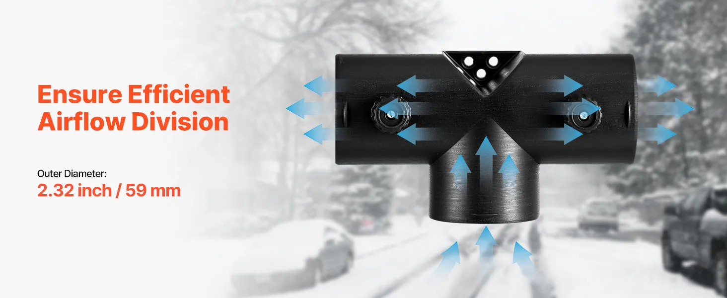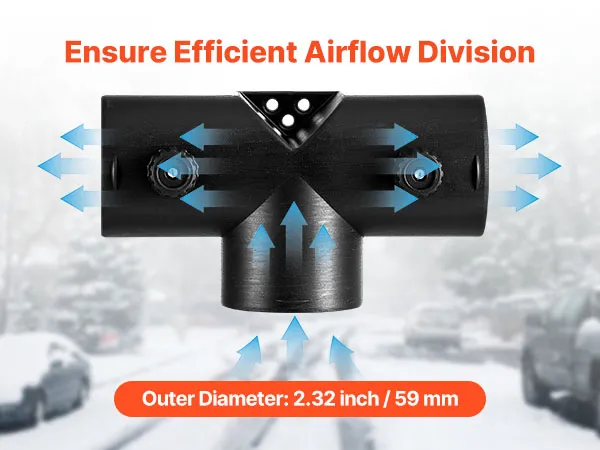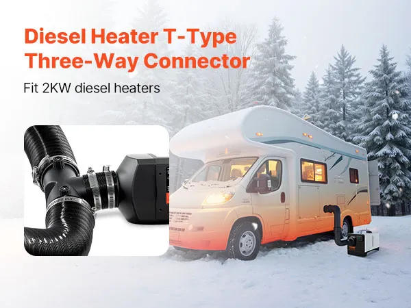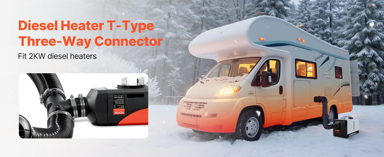 VEVOR diesel heater T shape connector with a 2.32 inch / 59 mm outer diameter is designed for efficient warm air distribution and control. Compatible with most 2KW diesel heaters, it is easy to install and built with high-quality materials that withstand high temperatures and long-term use.