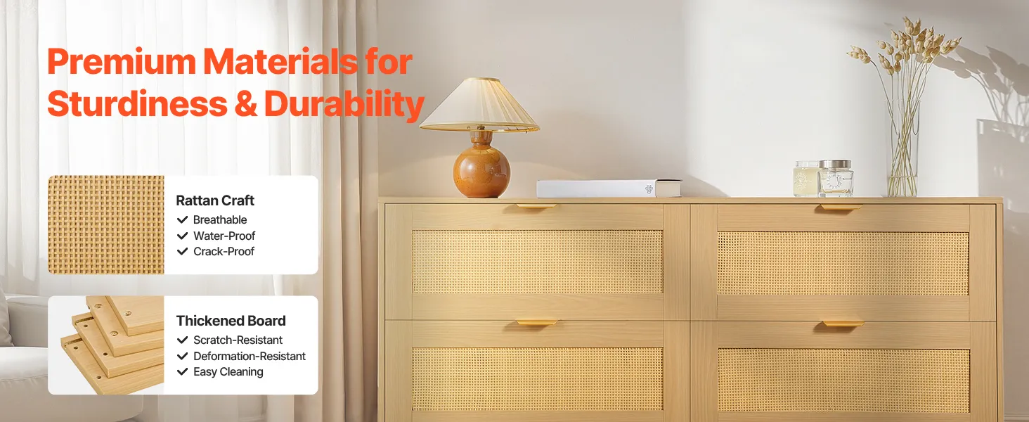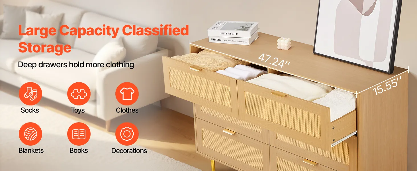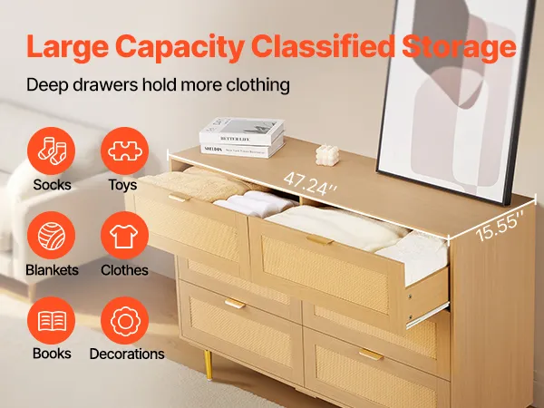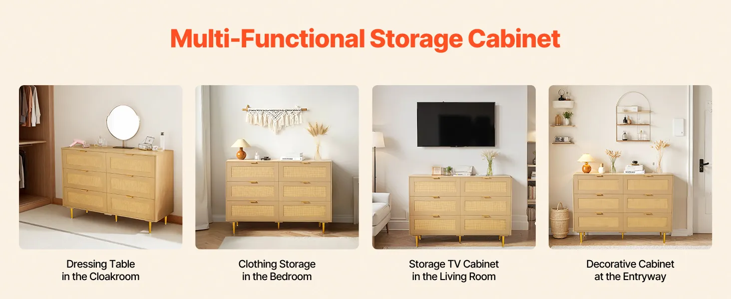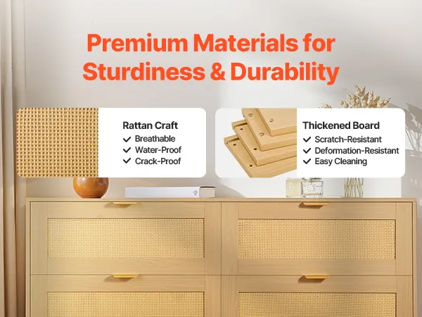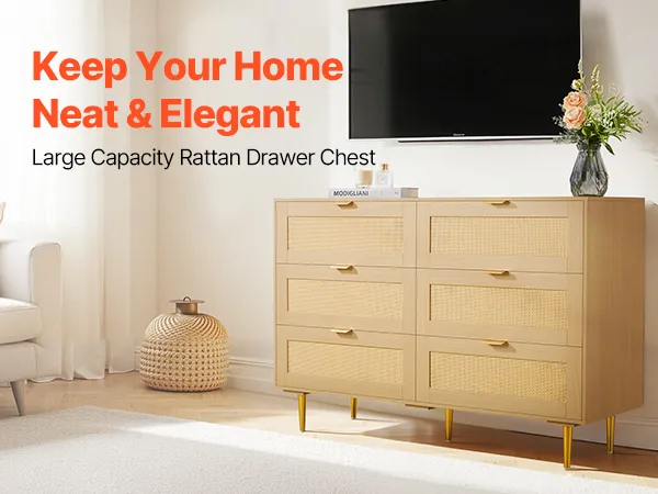 Our spacious rattan dresser provides multi-layer storage space. Featuring deeper and wider drawers, it can store a large amount of clothes and daily necessities in a classified manner. The top surface holds decorations or frequently used items, meeting diverse home organization needs.
