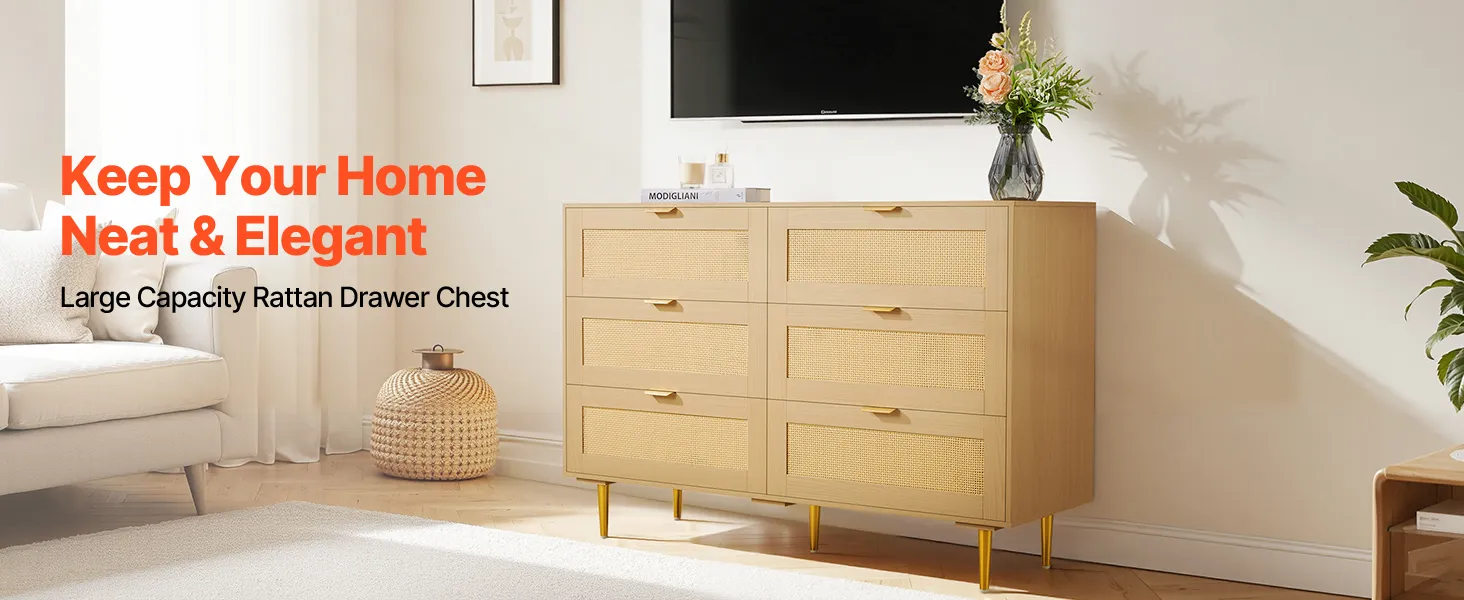 VEVOR 6 Drawer Rattan Dresser, Double Dresser for Bedroom, Natural Rattan Chest of Drawers with Metal Handles & Legs, Modern Wood Chest Clothing Organizer & Storage for Bedroom, Living Room, Hallway