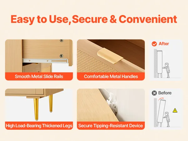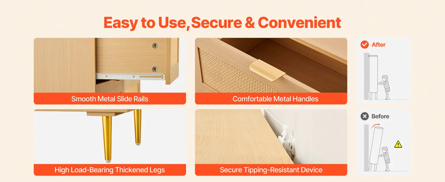 Our boho dresser comes with metal handles that provide a comfortable grip, paired with sliding rails that remain smooth when pushing and pulling. Its high-load-bearing legs and anti-tip device ensure reliable use, withstanding the wear of daily use, keeping it looking like new for a long time.