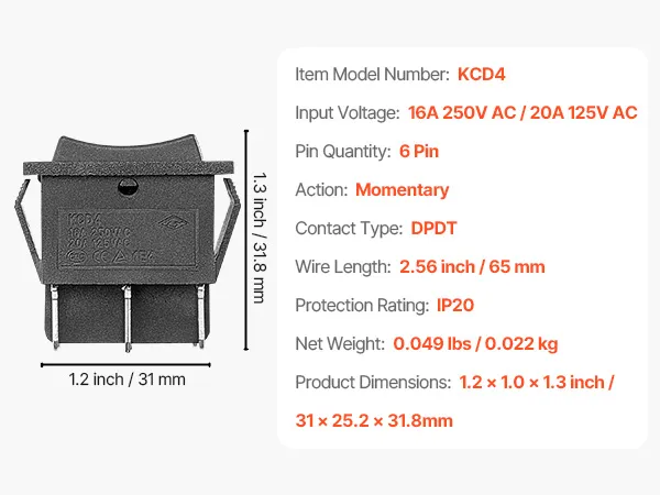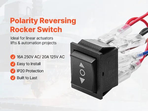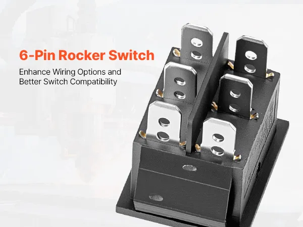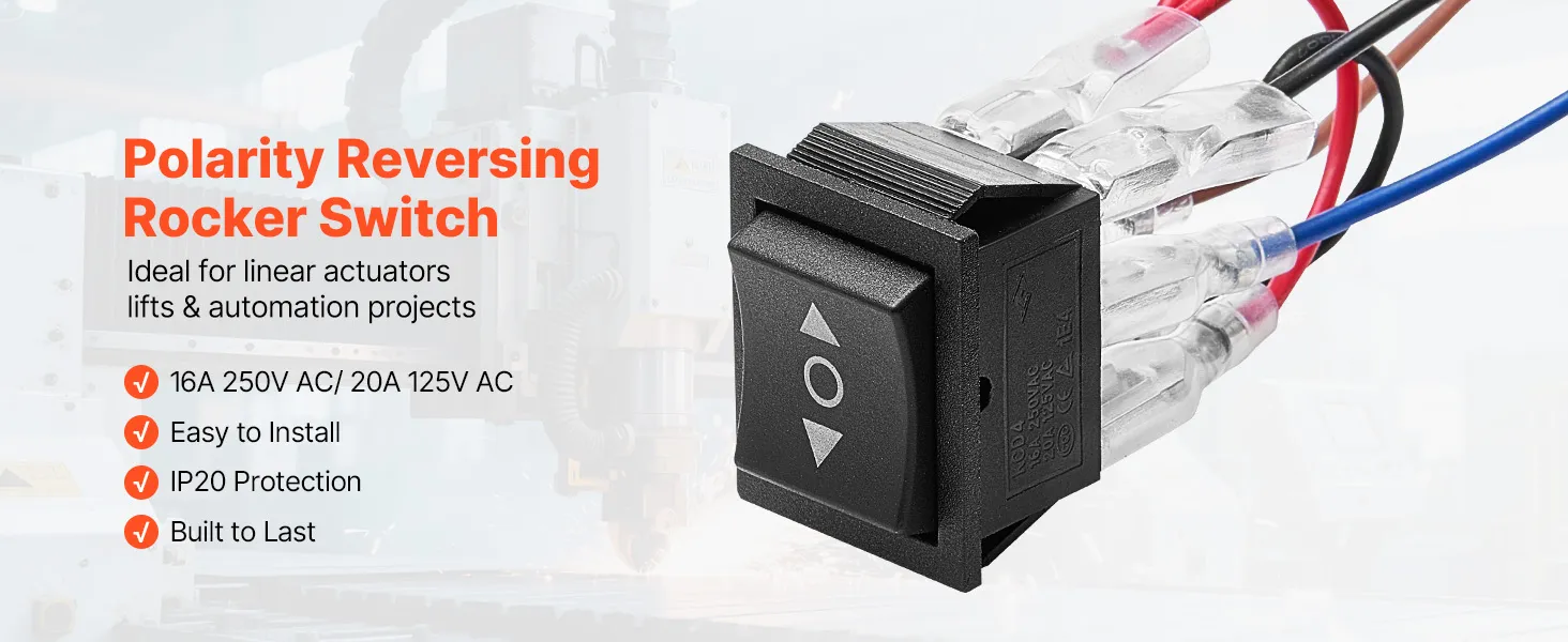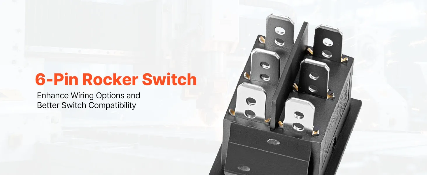 VEVOR 6-pin rocker switch features a momentary auto-reset function and a 3-position (ON)-OFF-(ON) design, offering smooth forward/reverse control. Rated for 16A at 250V AC and 20A at 125V AC, it delivers reliable performance across a wide range of DC motor systems.