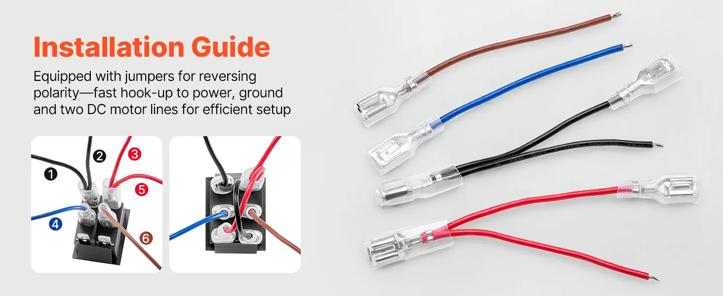 Built-in polarity reversing jumpers let you quickly hook-up to power, ground, and two DC motor lines for smoother control.