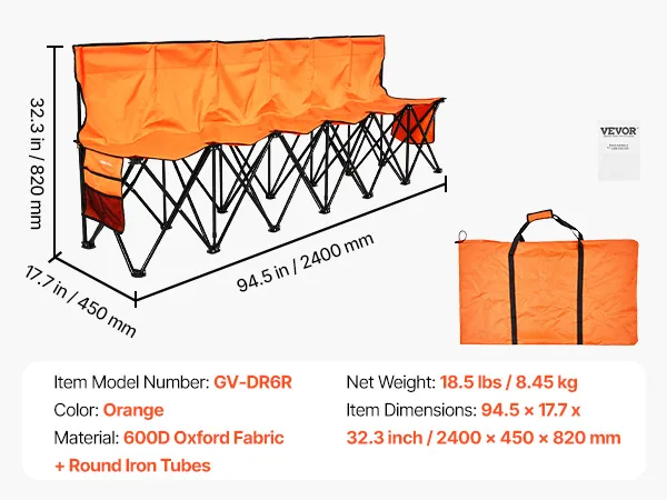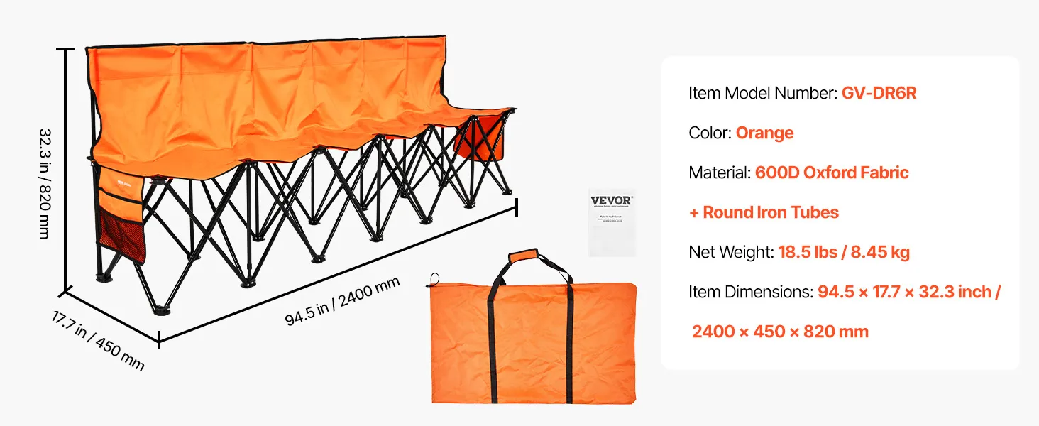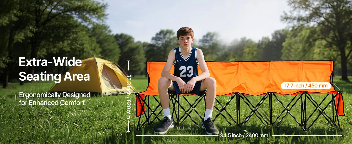 Складная скамейка VEVOR на 6 мест с спинкой и боковыми карманами, 2400x450x820 мм, для спорта, кемпинга и улицы, оранжевая