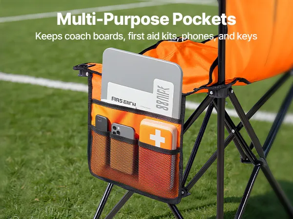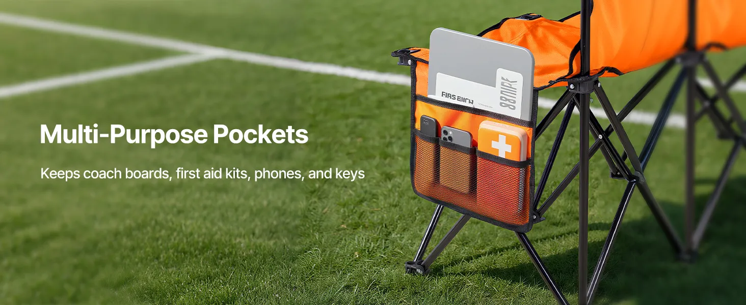 • User-Friendly Design: Side pockets are provided on both sides of the soccer bench, ideal for storing items such as a coach board, first aid kit, phone, and keys, offering thoughtful storage space
