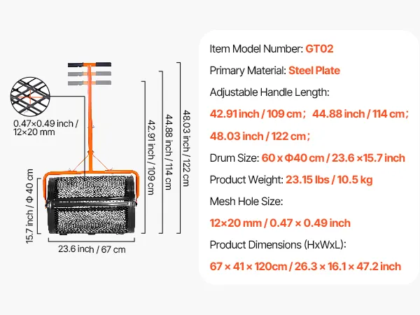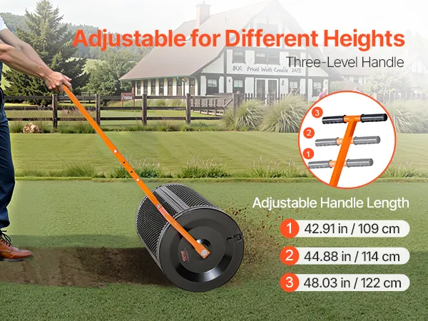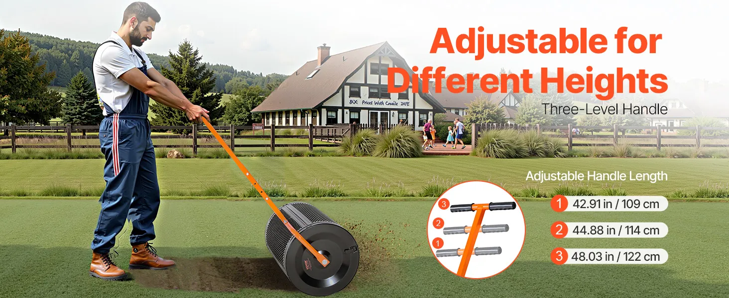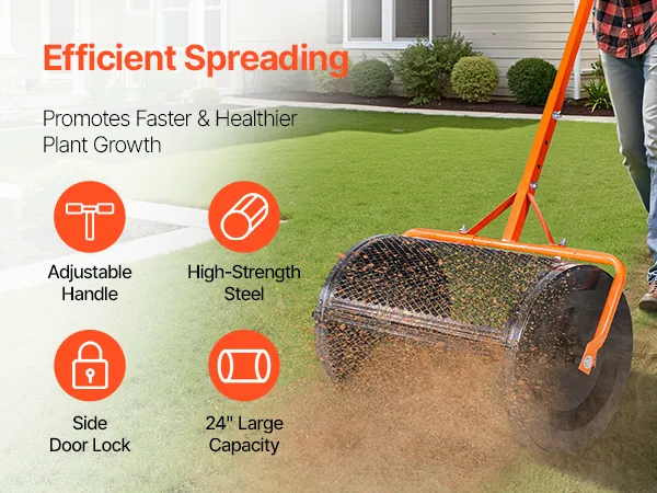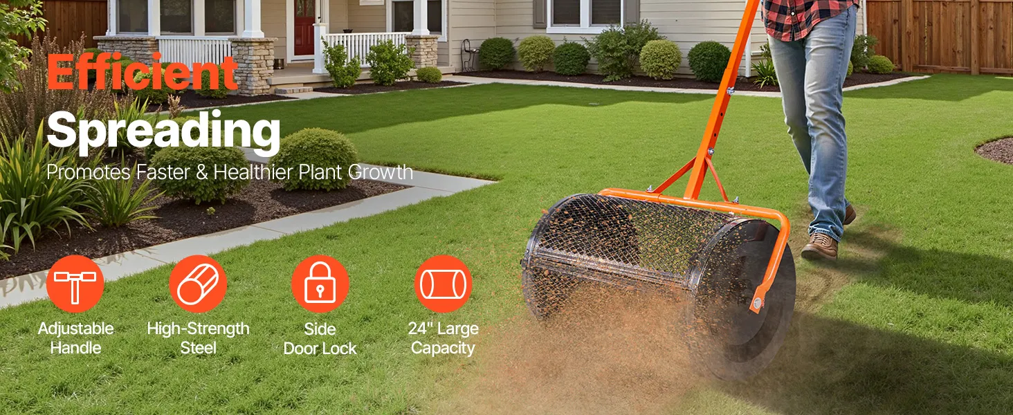 VEVOR Compost Spreader, 24 in Wide Peat Moss Spreader with T Shaped Handle, 3 Heights Adjustable, Powder-Coated Steel Garden Peat Moss Roller, Heavy Duty Grass Seed Spreaders for Planting Seeding