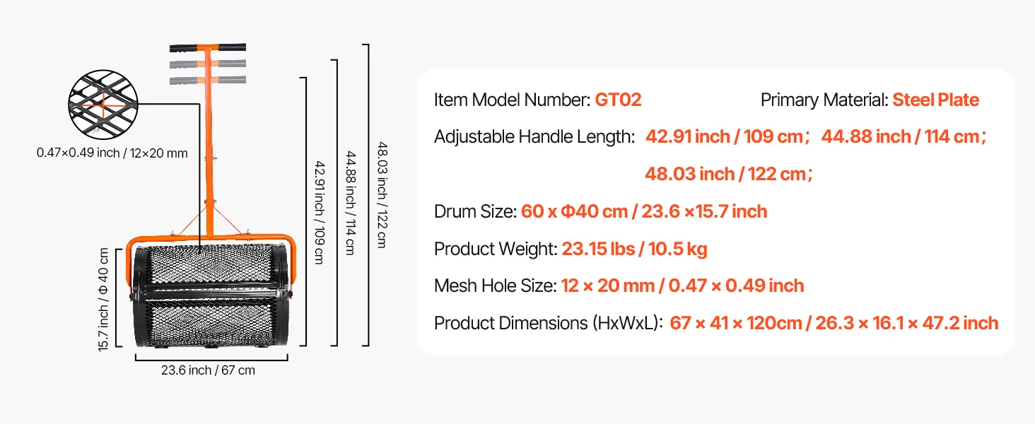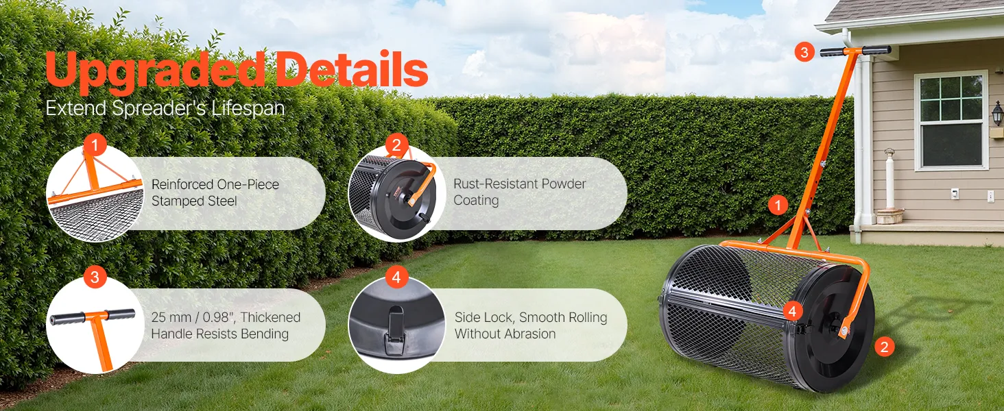 Our 24-inch compost spreader combines efficient spreading, reduced strain, extended durability, generous capacity, and quick assembly. Whether you're a beginner or a seasoned gardener, you'll enjoy the ease of operation for greener lawns, more vibrant gardens, and more bountiful fields.