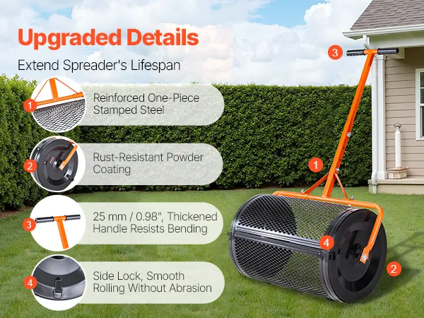 The integrated stamped steel construction ensures a sturdy structure. A powder-coated finish resists rust, while the 25 mm/0.98 in thick handle provides added strength and durability. The side latch prevents wear. These details extend the lifespan of the lawn spreader for long-term use.