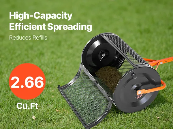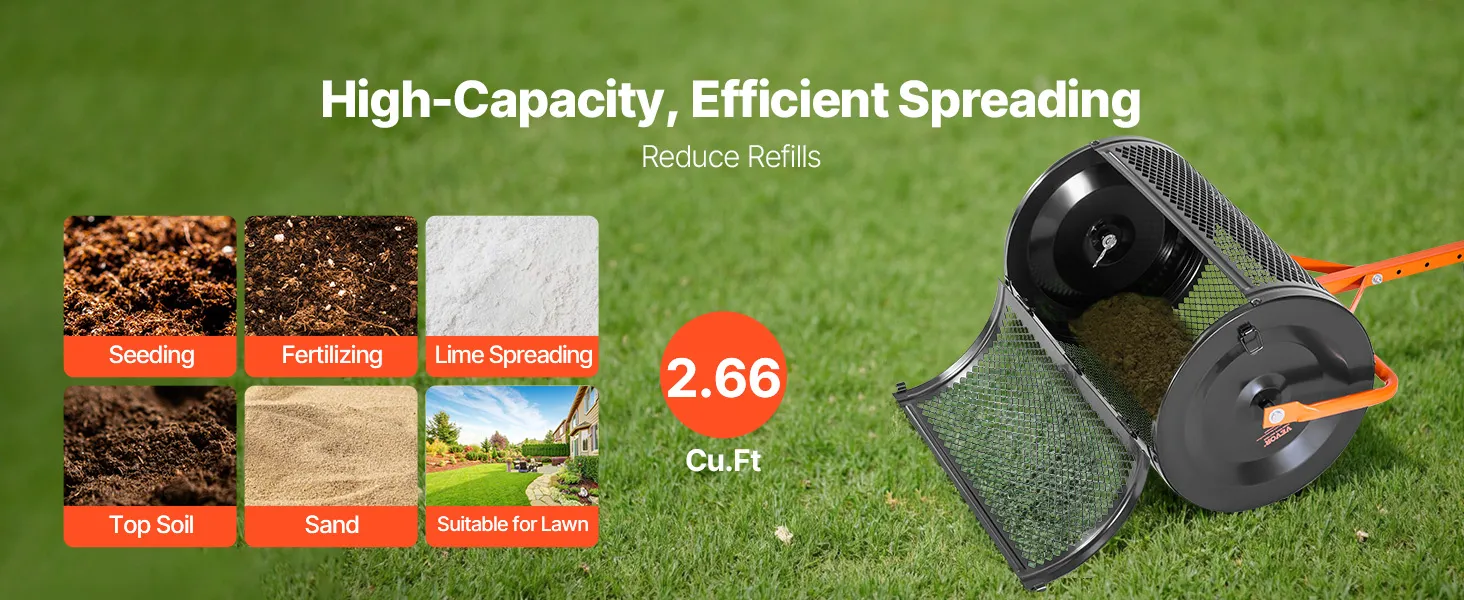 The 24-inch drum holds up to 2.66 cubic feet of seeds, fertilizer, lime, topsoil, or sand. Designed for large areas like lawns, gardens, and farmlands, the high-capacity drum reduces refill times and increases productivity.