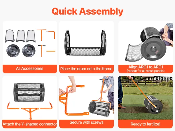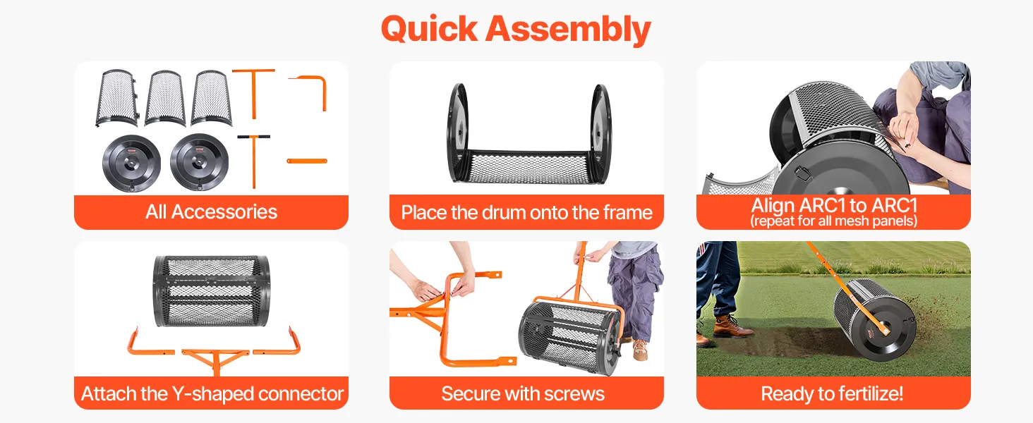 Start spreading in just a few steps: install the rotating disc, connect the mesh grid, attach the Y-shaped bracket, and tighten the screws. This high-efficiency peat moss spreader ensures even nutrient delivery to your crops.