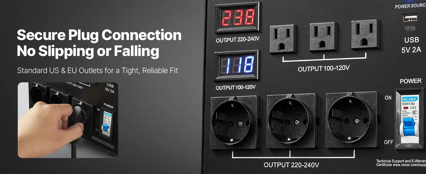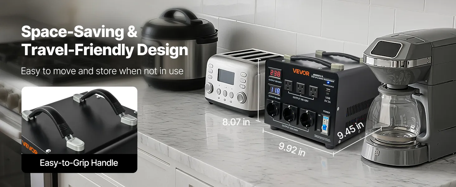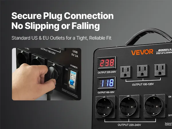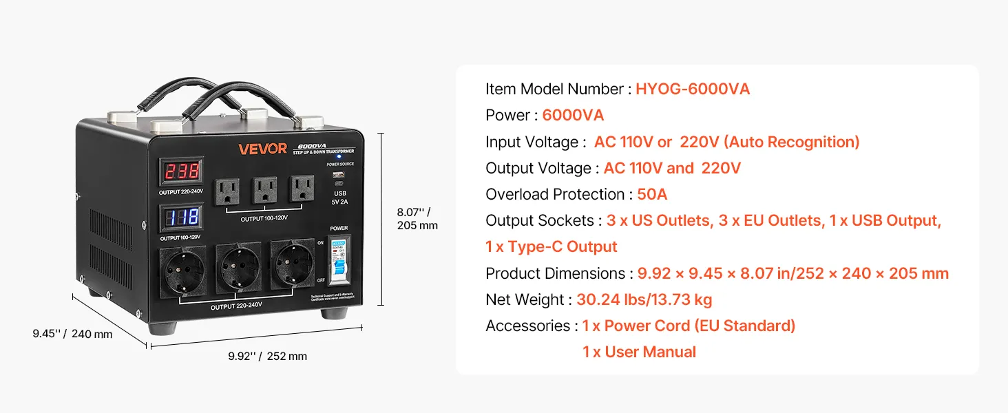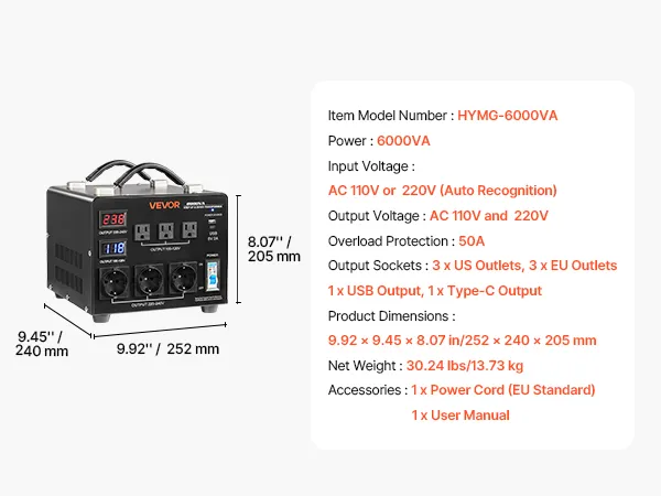 • 6000VA Voltage Converter Transformer: Delivers up to 3000VA with 80% max load. With three standard US output sockets, three EU output sockets, 1 USB output, and 1 Type-C output, this step up down voltage transformer powers multiple appliances at once