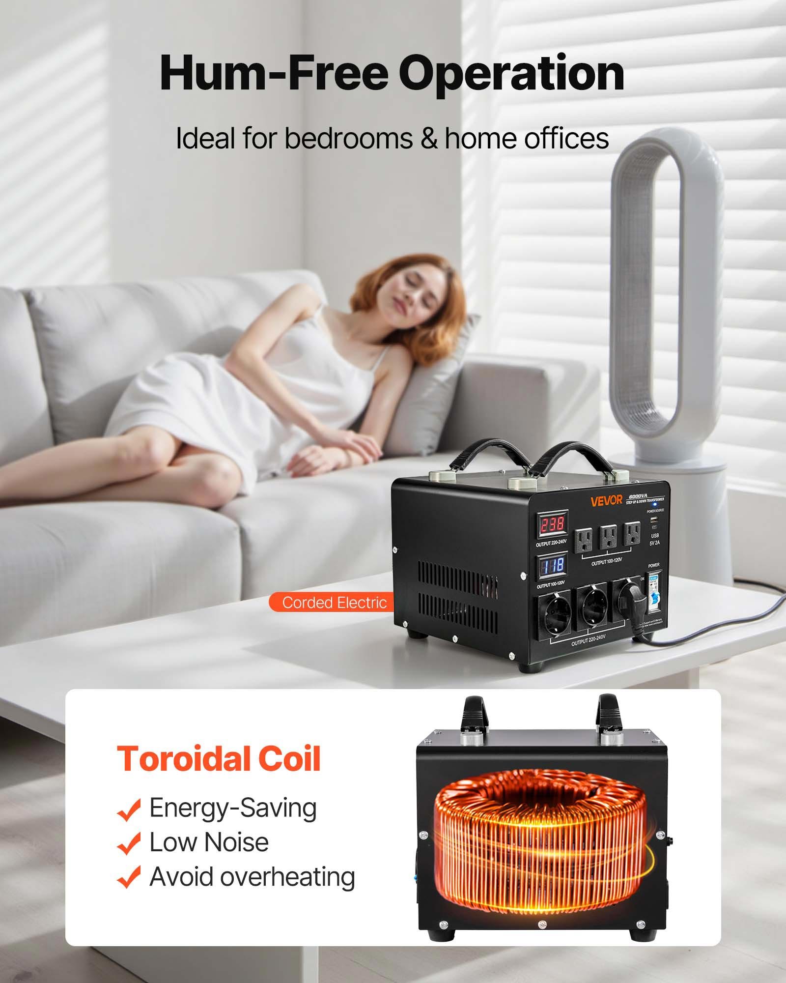 • Efficient & Quiet Operation: The quality toroidal coil reduces noise, heat, and weight, ensuring precise and stable voltage output. This voltage transformer power converter delivers smooth, near-silent performance, even during long sessions
