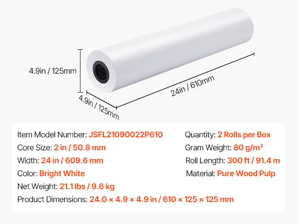 This box of wide format paper includes 2 rolls, each 24 inches wide and 300 feet long, precisely measured at 80 g/m² for consistent, high-quality results. The 2-inch core fits most standard plotter printers.