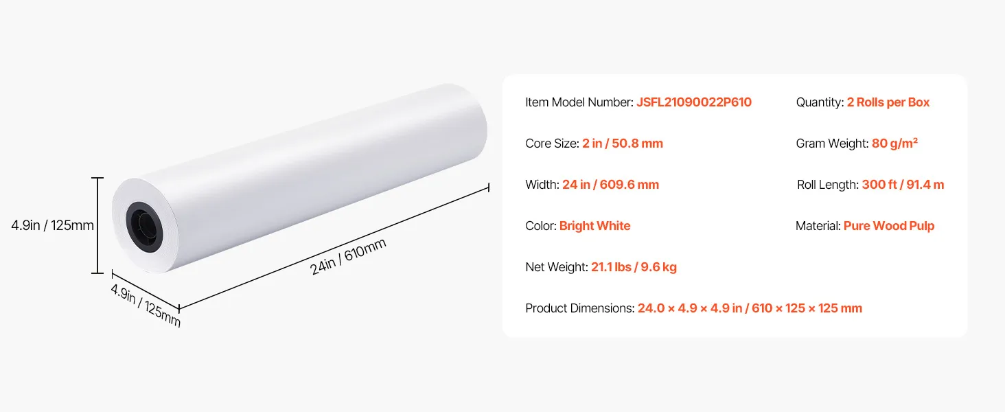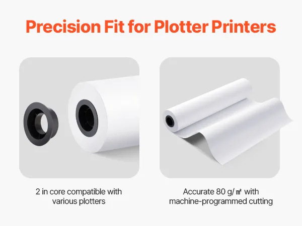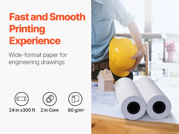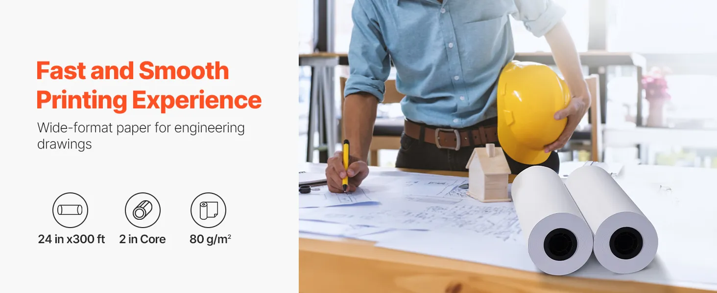 VEVOR Wide Format Paper, 609.6 mm x 91.4 m Plotter Roll, 2 Rolls CAD Bond Rolls with 50.8 mm Core, 80 GSM Plotter Roll Rolls, for CAD Drawings, Engineering Plans, GIS Maps, and Architectural Designs