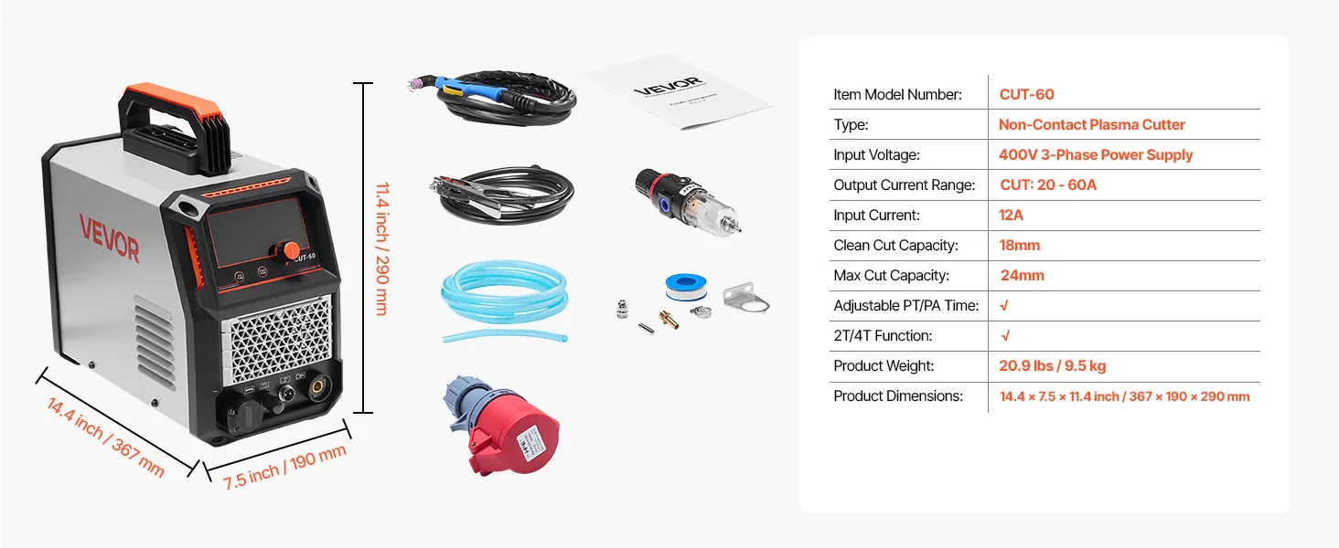VEVOR Plasma Cutter, 60A Non-Touch Pilot Arc Plasma Cutting Machine, Digital Display IGBT Inverter - with 2T/4T Function & Adjustable PA/PT Time for Industrial Use (400V 3-Phase Power Supply)