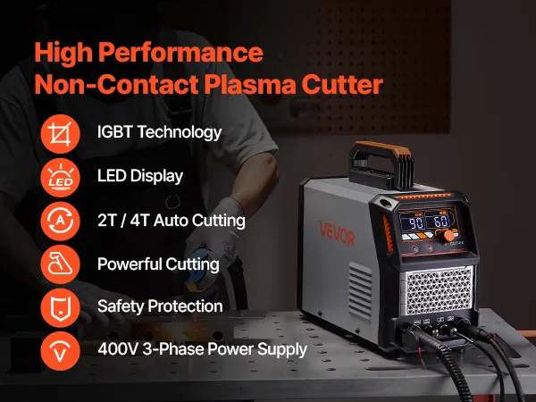 This 400V 3-phase plasma cutter delivers a powerful 60A output, easy to cut through various metals. With non-touch pilot arc, smart control, 2T/4T function, clear digital display and complete accessories, it ensures stable output for smooth and efficient cutting for industrial applications.