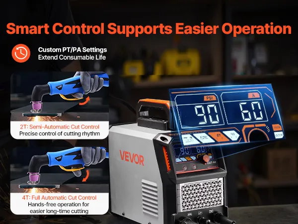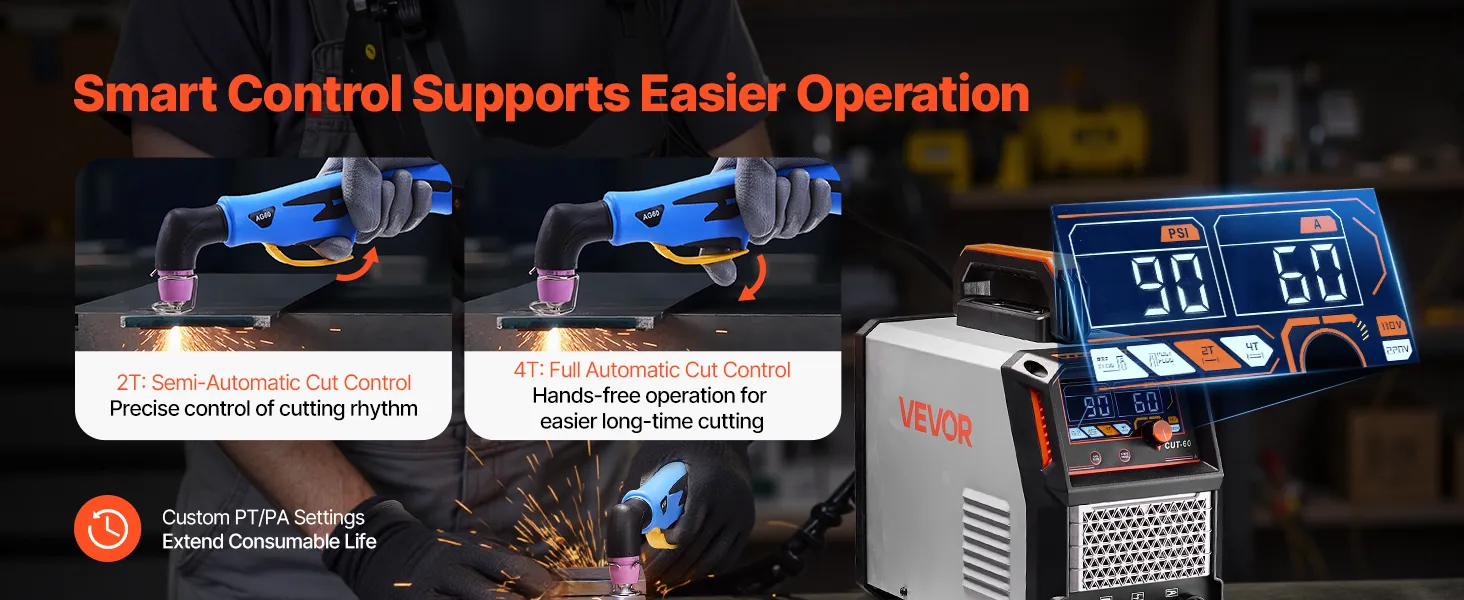 Our 3-phase plasma cutter features both 2T and 4T functions: 2T enables semi-automatic cutting for short, precise tasks, 4T supports automatic cutting for extended continuous operations. Also supports adjustable PT/PA time to extend the life of consumables.