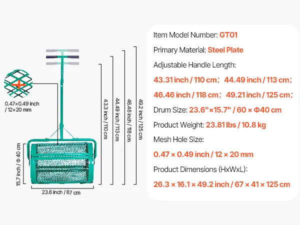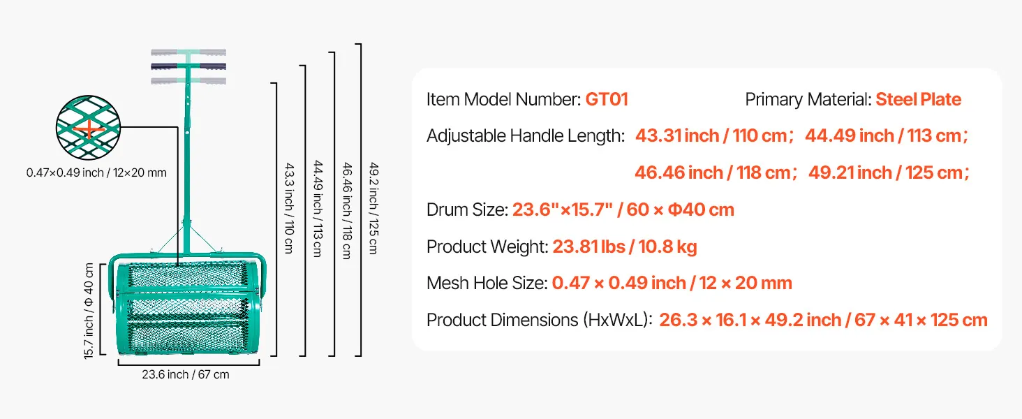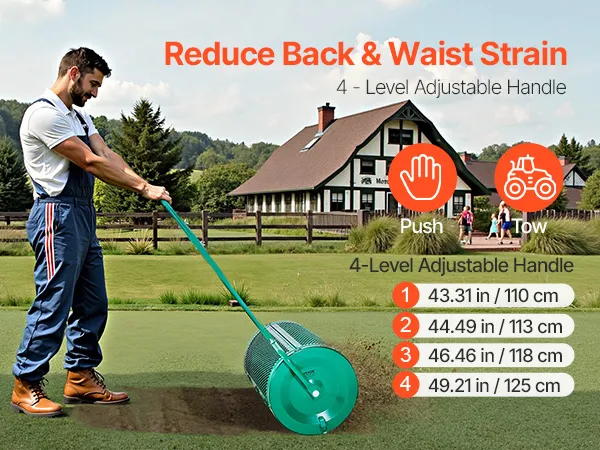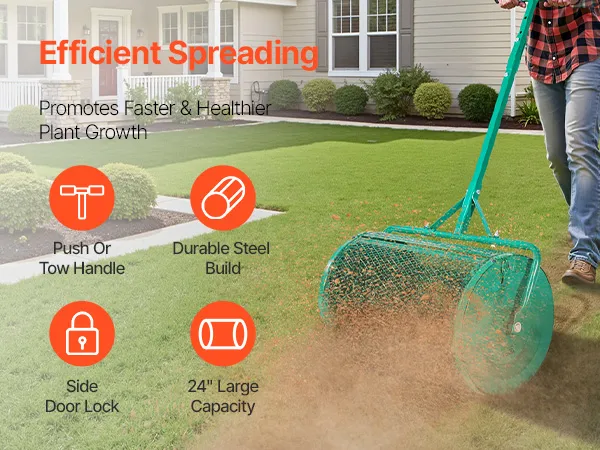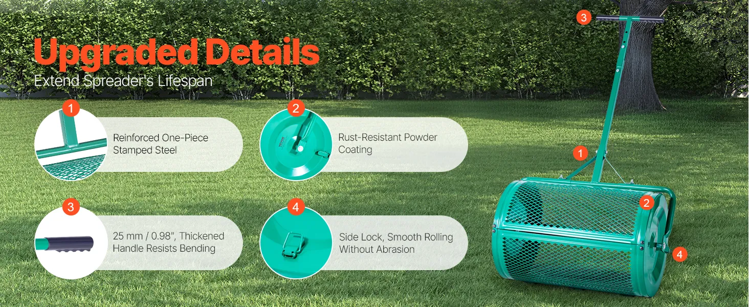 Our 24-inch compost spreader features 4-level adjustable spreading, reduced strain, enhanced durability, large capacity, and easy assembly. Whether you're a beginner or a seasoned pro, you'll enjoy the effortless operation. Achieve greener lawns, more beautiful gardens, and higher-yield fields.