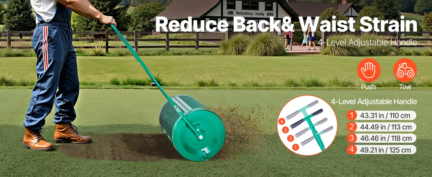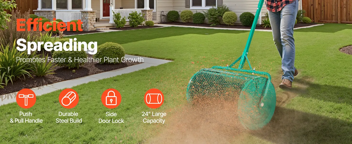 VEVOR Compost Spreader, 24 in Wide Peat Moss Spreader with Push/Tow Handle, 4 Heights Adjustable, Powder-Coated Steel Garden Peat Moss Roller, Heavy Duty Grass Seed Spreaders for Planting Seeding