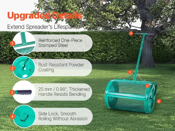 The drum is crafted with integrated stamping technology for a solid structure. A powder-coated finish adds rust resistance, while the 25 mm (0.98 in) handle provides extra strength. A side-lock prevents wear during rolling. The details extend the lawn spreader's service life for long-term value.
