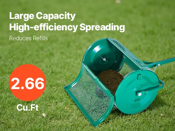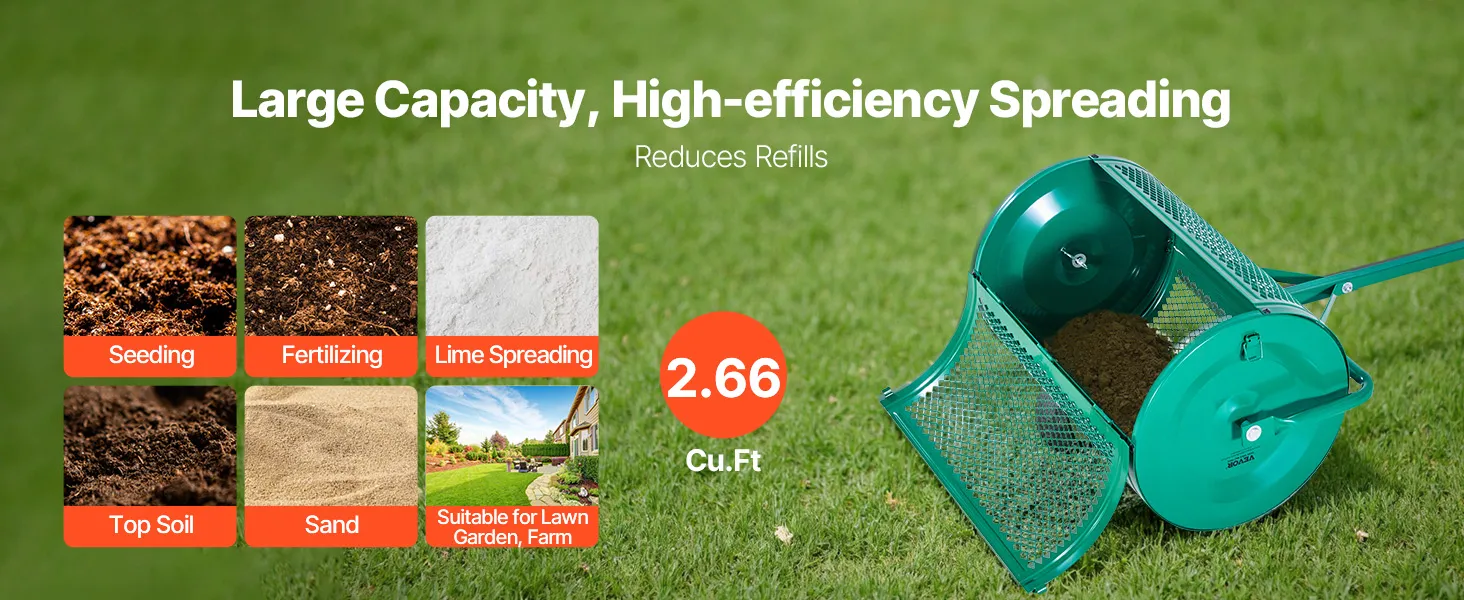 The 24-inch drum holds up to 2.66 cubic feet of seed, fertilizer, lime, topsoil, or sand. This lawn spreader is ideal for large lawns, gardens, or farmlands. This generous capacity minimizes the need for constant refilling and boosts productivity.