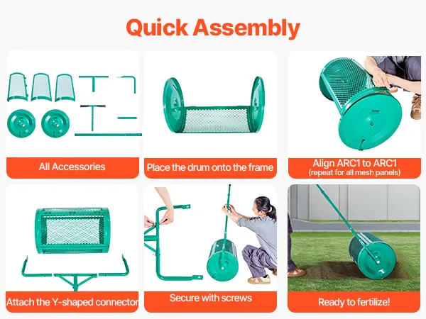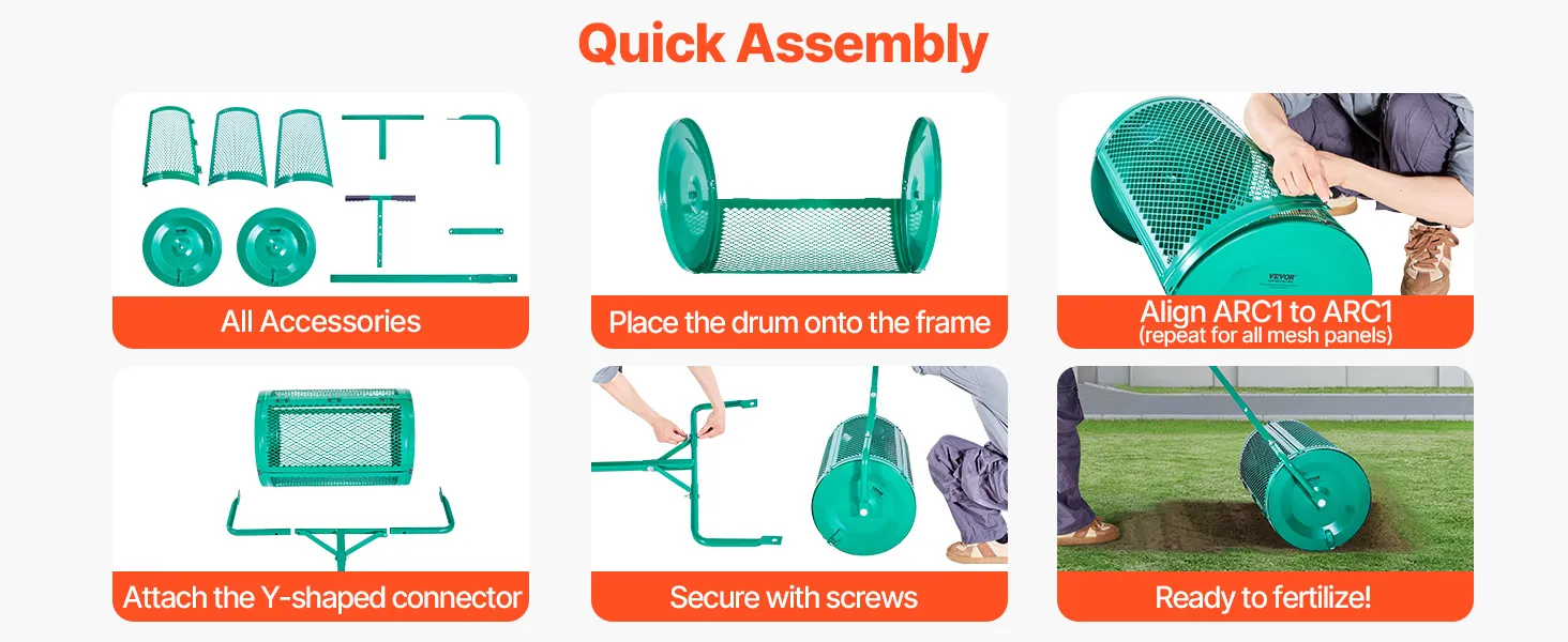 Start spreading in no time—simply install the rotating disc, attach the mesh, connect the Y-shaped joint, and secure with screws. The peat moss spreader with precision mesh design ensures even fertilizer distribution, delivering balanced nutrients to your crops.