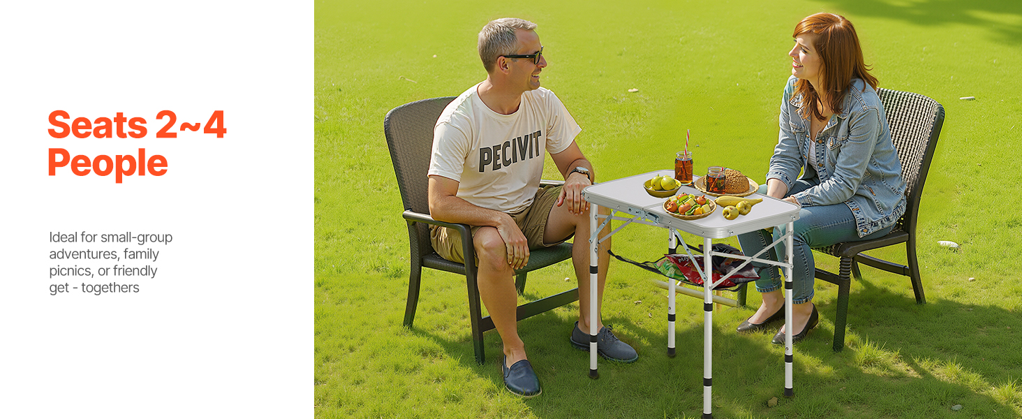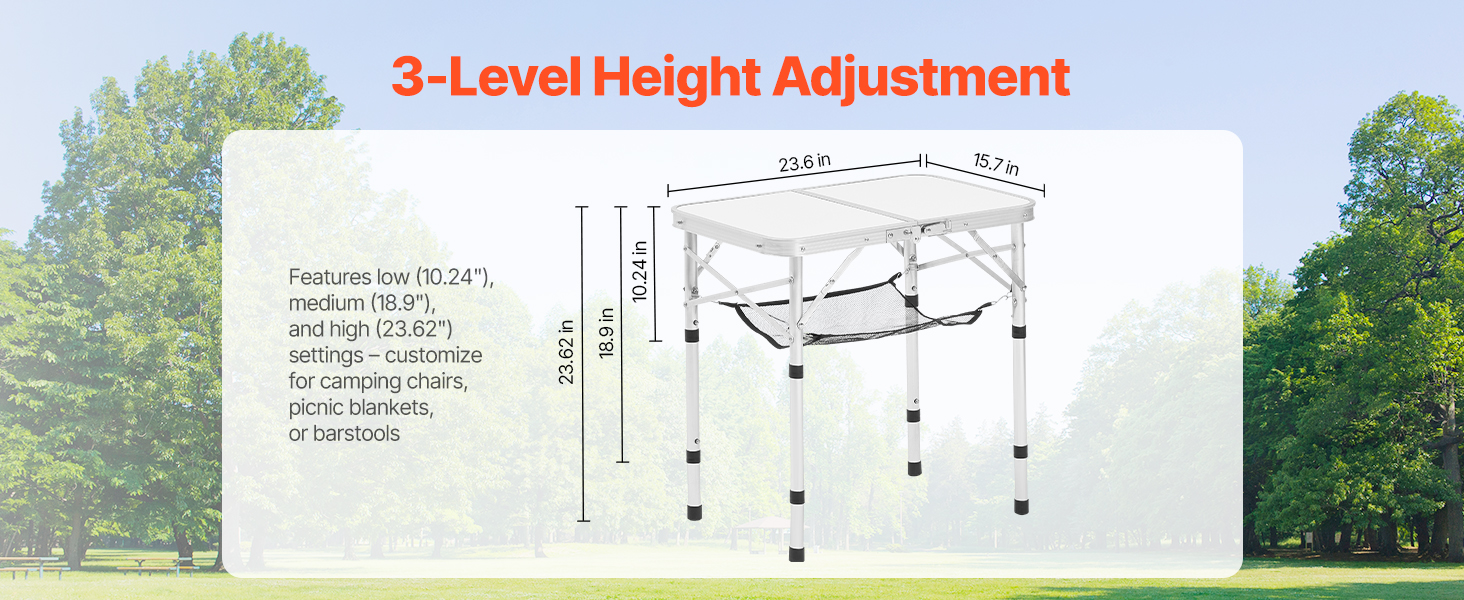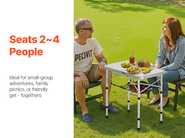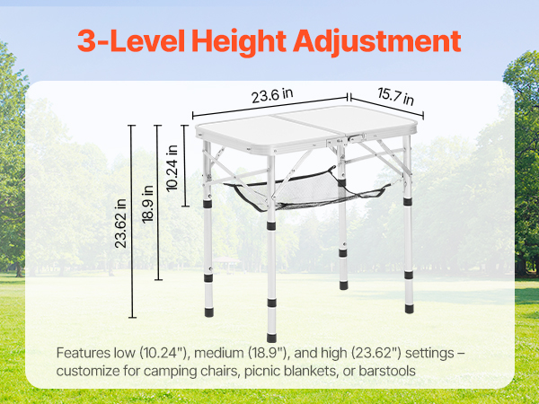 • Three-Stage Height: The camping table adapts to various occasions with three-stage height adjustment: 10.2/18.9/23.6 inch via adjustable legs. 23.6×15.7 in tabletop seats 2-4 adults, ideal for intimate dinners, gatherings, or light work