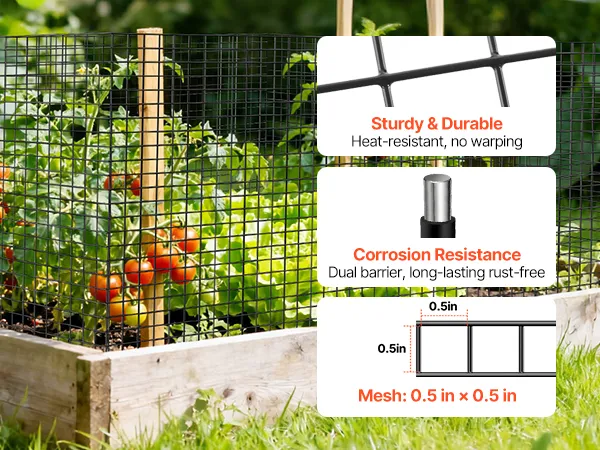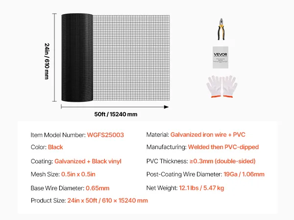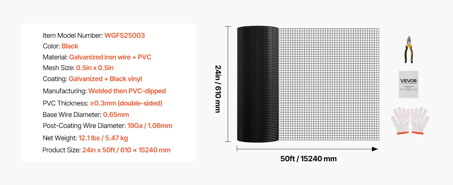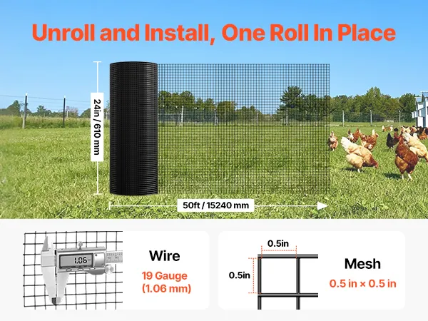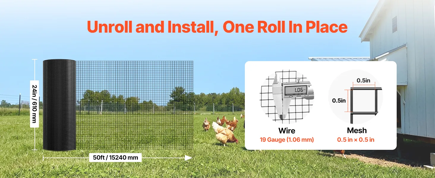 VEVOR Hardware Cloth 61cm x 15.2m, 1/2 in 19 Gauge Galvanized Wire Mesh Roll, Weather-Resistant Vinyl Coated Chicken Wire Fencing, Heavy Duty Welded Garden Plant Fencing for Rabbit Cage Snake Fence